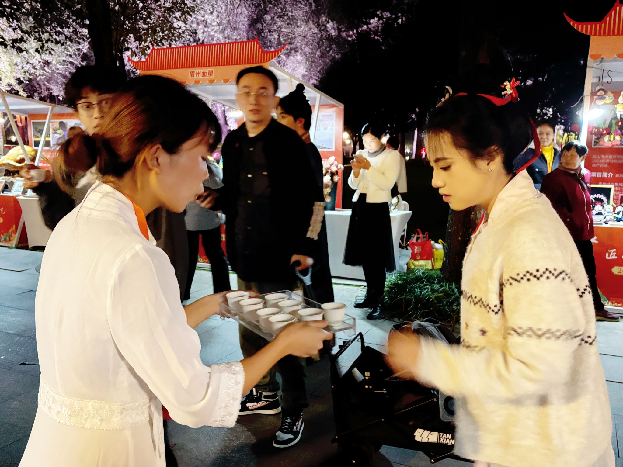 在互动体验环节,学子们化身文化向导,手把手指导群众尝试调膏、击拂,让大家沉浸式体验宋韵生活的雅致。此外,学子们还协助开展茶百戏展示与文创推广活动,向游客推介融合东坡诗词与点茶美学的限定茶器等文创产品,生动讲解设计理念,助力非遗技艺转化为现代消费品,推动文化流量向消费增量转化。