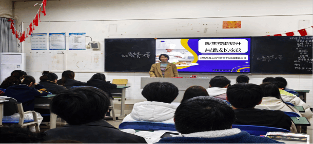 11月24日,旅游与财贸学院兼职班主任杨丽红在2508教室召开企业集中实训总结主题班会,2024级烹饪工艺与营养专业2班全体学生参会,活动围绕实训成果、心得反思及未来规划展开交流。