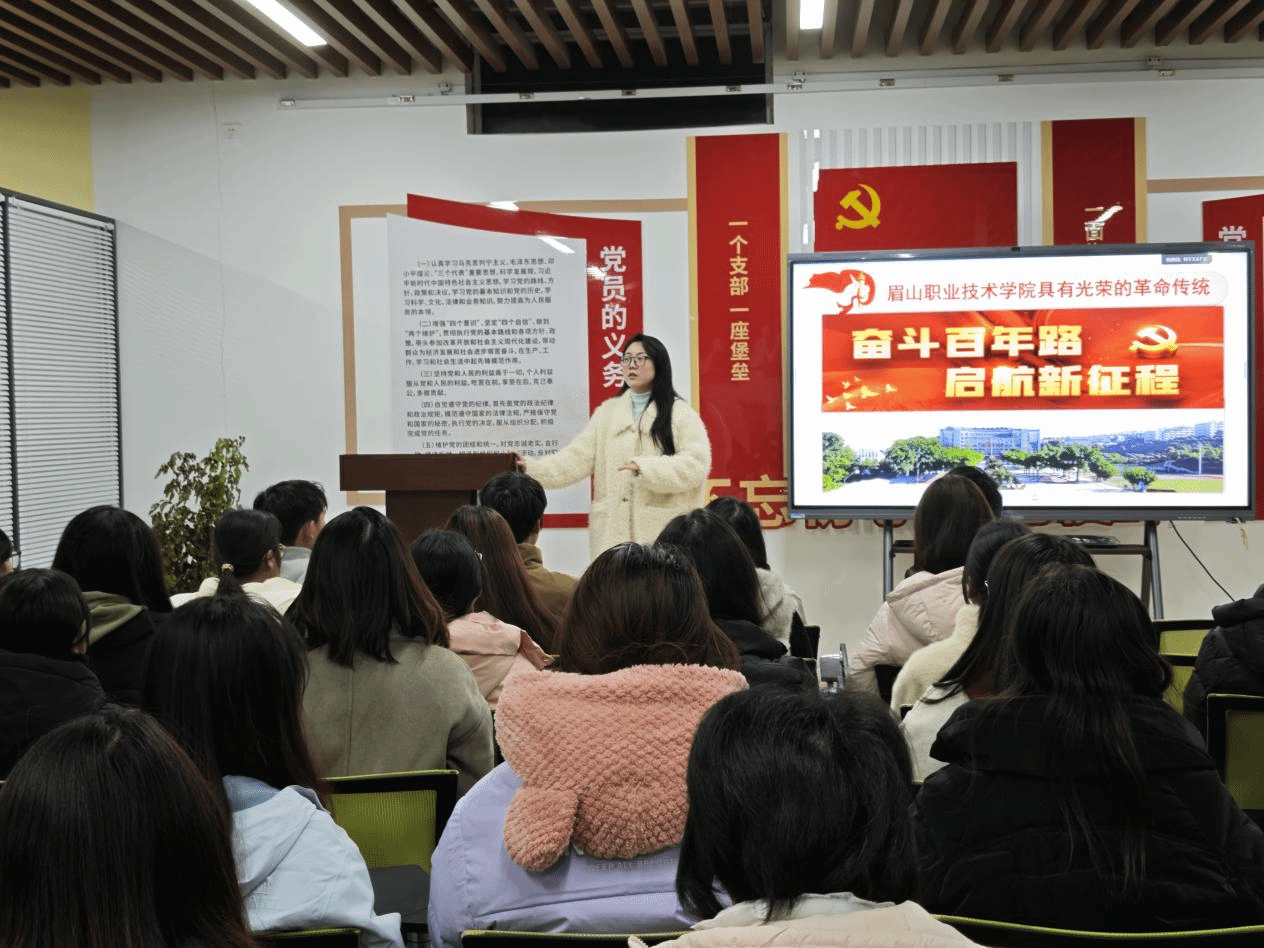 12月17日,旅游与财贸学院辅导员老师侯佳敏在学校“一站式”学生社区中心组织开展“三讲三传”育人实践活动,本次活动以“传承红色基因,续写眉职荣光”为主题,2024级烹饪工艺与营养专业3班全体同学参加。