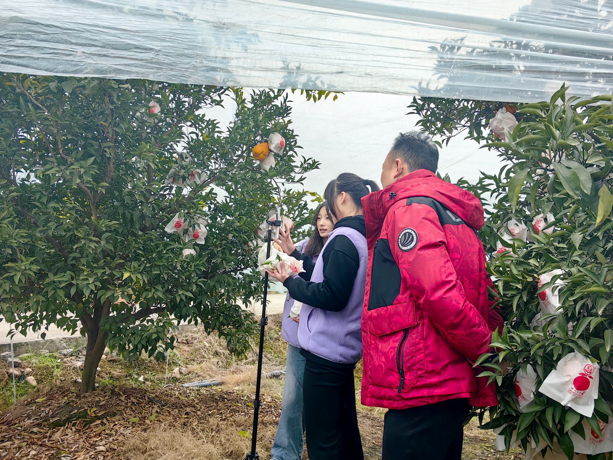 活动聚焦社区特色柑橘产业,以专业力量助力乡村振兴。在社区党委书记李健带领下,团队走进四千余亩柑橘种植基地及高标准示范园。连片果园枝繁叶茂,春见、明日见等优质品种挂满枝头,果实以果肉细腻、甜度饱满著称。该产业不仅是社区的“绿色银行”,还带动了大量居民就近就业,有效缓解城乡结合部就业压力,形成“示范引领、全民增收”的发展格局,成为社区高质量发展的重要支撑。实践团围绕柑橘开展专场直播推广,队员郭慧、易小雪发挥电商专业特长,与李健共同在直播间生动讲解柑橘的种植环境、品质特点和食用价值,通过直观展示与互动问答吸引关注,助力优质柑橘走出乡村。团队还向社区工作人员及种植户分享了直播话术、引流策略与客户维护等实用技巧,巩固“带不走的技术”成果。