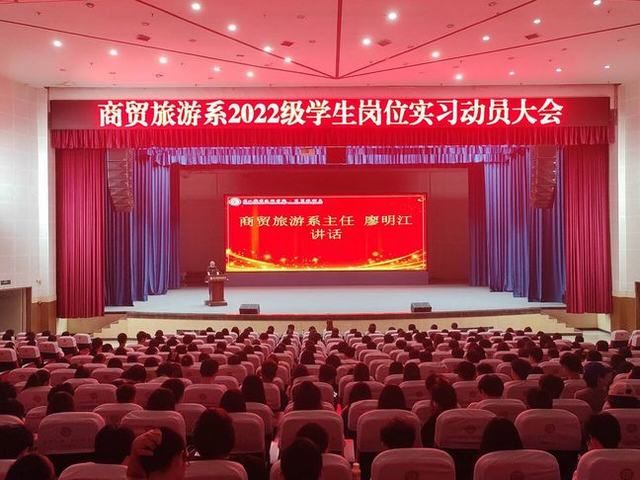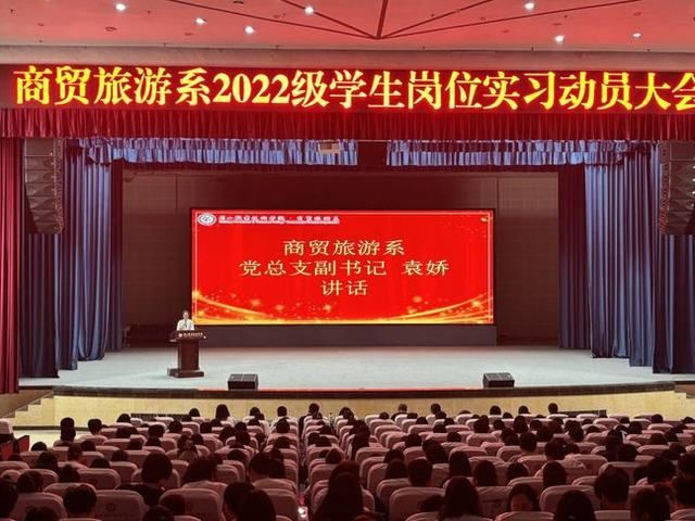 为做好2022级学生岗位实习工作安排,4月27日,商贸旅游系在艺术中心召开岗位实习动员大会,系主任廖明江、党总支副书记袁娇、各专业负责人、2022级学生辅导员及2022级全体同学参加大会。
