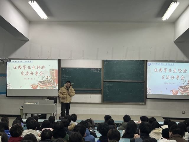 分享会上,李一民介绍了尚荣洲基本情况,并对其回校交流表示欢迎,希望在校学生认真聆听思考。尚荣洲深情回顾了三年的在校学习时光,分享了担任团学干部的点滴成长,感谢老师们的悉心栽培。他以质朴的语言分享了求学、实习、工作各阶段的心路历程,强调在工作和学习中要做到踏实稳重、虚心求教,科学做好学业规划、时间协调,处理好就业与升学的关系。他鼓励学弟学妹们要珍惜美好的大学时光,永远不要停止学习的脚步,灵活运用所学,创造美好未来。在互动交流环节,同学们踊跃提出自己的困惑和疑问,尚荣洲结合自身经历与实践耐心解答。
