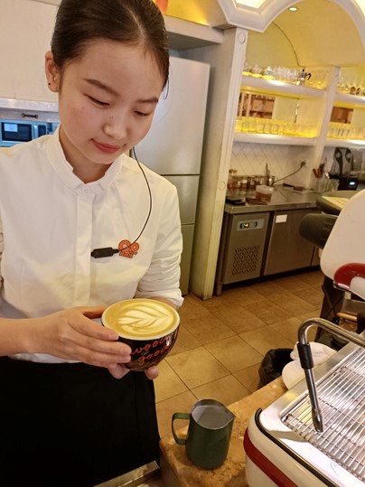 杨晓英,女,2022级酒店管理与数字化运营1班学生,现在良木缘咖啡西餐有限责任公司实习,负责迎宾送客、点餐上餐及饮品制作等工作。