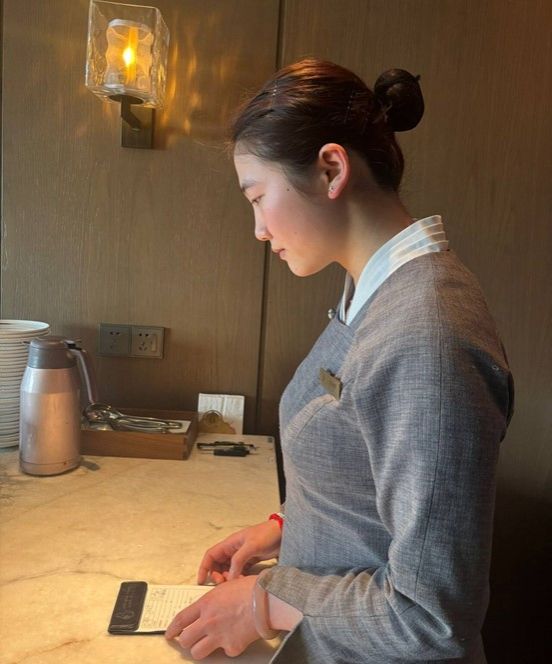 陈芯茹,女,2022级烹饪工艺与营养2班学生,现于苏州工业园区金海华餐饮管理有限责任公司实习,负责推荐菜品、介绍菜品、上菜、服务客人用餐等工作。
