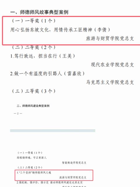 近日,学校党委发布《中共眉山职业技术学院委员会关于公布学校2024年师德师风典型案例评选结果的通知》,旅游与财贸学院党总支师德师风故事典型案例《用心弘扬东坡文化,用情传承工匠精神》荣获一等奖,师德师风建设典型案例《“三个坚持”铸师德师风之魂》荣获二等奖。