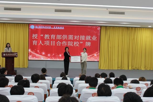 仪式上,刘菲介绍了“教育部供需对接就业育人”项目背景和基本情况,希望商贸旅游系与悟境餐饮管理有限公司以此为契机,积极探索供需对接模式,共同做好项目实施,进一步提升人才培养、就业服务与社会环境、企业需求的契合度,促进毕业生高质量就业。袁娇对各位企业合作方领导的到来表示诚挚的欢迎,介绍了系部对接专业的建设情况、供需对接就业育人项目开展情况,希望校企进一步加强交流、拓宽渠道,共同培养更多的高素质技术技能型人才。吴欣豪介绍了企业背景、产业布局、业务规模发展等情况,希望校企双方积极探索合作交流新机制,建立紧密合作关系,实现校企合作共赢。随后,校企双方互授“就业实习基地”“教育部供需对接就业育人项目合作院校”牌匾,廖明江向企业客座教授、就业导师颁发证书,标志教育部供需对接就业育人项目正式启动。