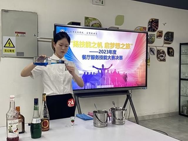 经过初赛的比拼,共有15组选手进入决赛,决赛包含餐宴会摆台、鸡尾酒调制两个赛项构成。赛场上,选手们身着职业装,精神饱满、动作娴熟,展现了良好的职业气质与专业素养。经过激烈的角逐,最终评选出一等奖1组、二等奖3组、三等奖5组。