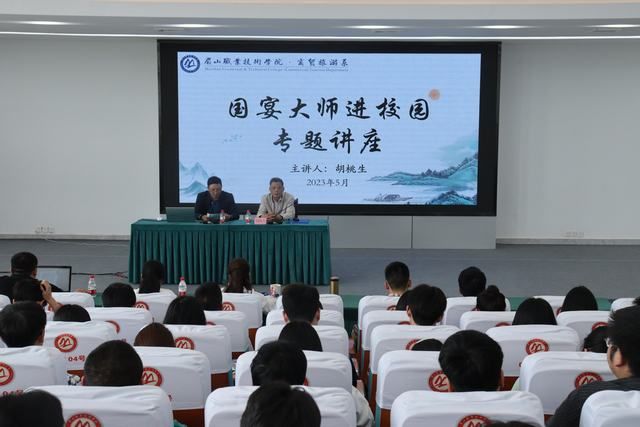 在学校招就中心二楼多功能厅,胡桃生讲述了自己从学徒做起,奋斗成国宴烹饪大师的心路历程,分享了他40余年厨道上积累的行业经验,从国宴意义、国宴发展历程、国宴菜肴烹饪方法等方面对国宴文化和技艺进行讲解。诙谐风趣的语言赢得了在场师生阵阵掌声,让大家在欢愉间了解了国宴不仅仅是中国最顶级的饭局,也是一种文化展示。