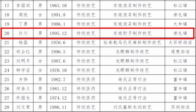 本次申报遴选旨在为有效保护和传承非物质文化遗产,经过申报、资料审查、实地调查、专家评审委员会审议、网上公示等程序,认定了28名非遗项目代表传承人,包含了龙眼酥制作技艺、东坡泡菜制作技艺、川派东坡古琴艺术等类别,许川入选为东坡肘子制作技艺传承人,是本次认定的东坡肘子类别的唯一传承人。