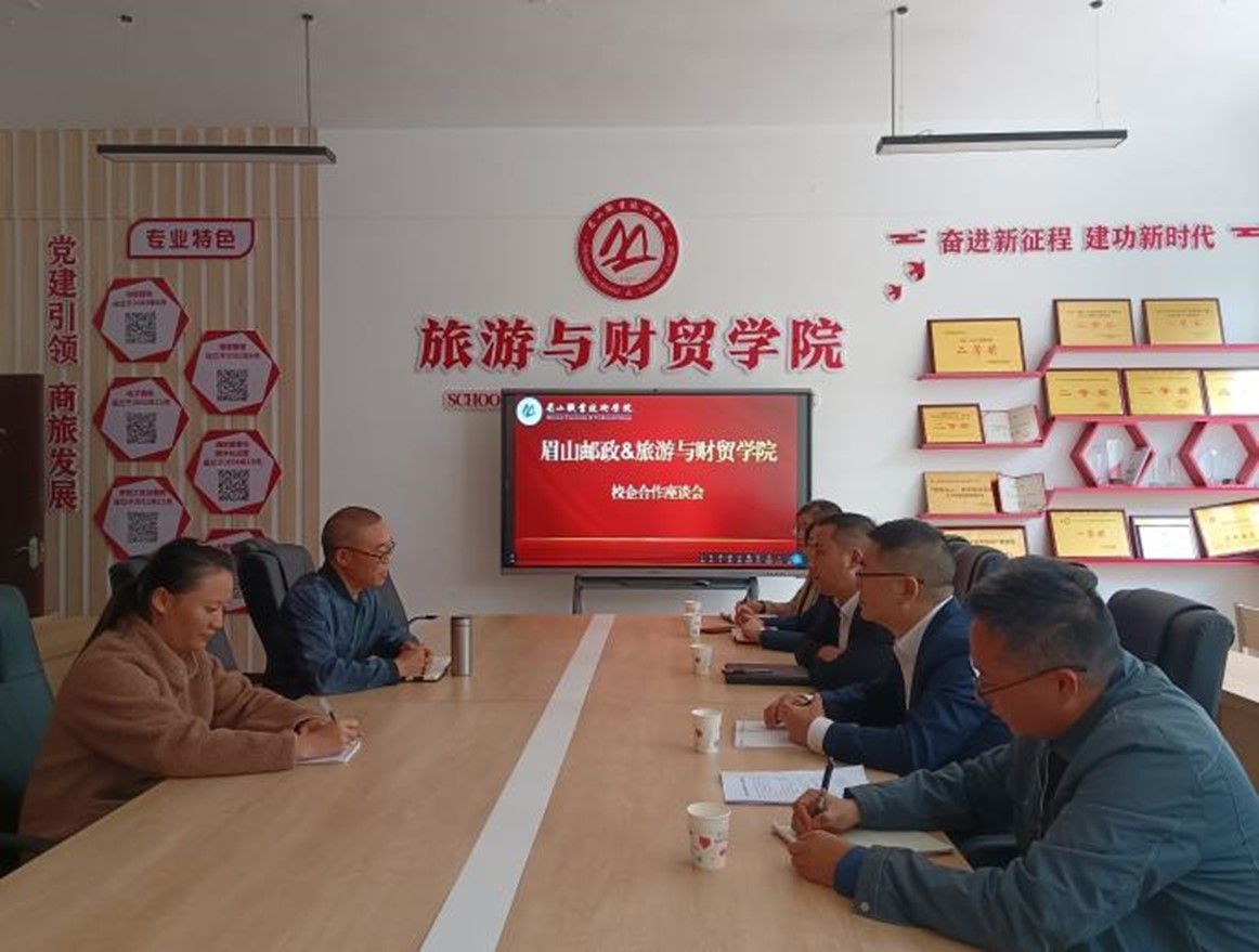 10月23日,旅游与财贸学院财贸教研室与中国邮政集团有限公司眉山市分公司在2212会议室召开校企合作座谈交流会,院长廖明江、青年教师吴敏参加会议。