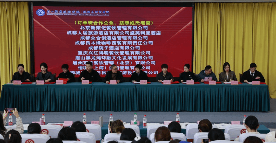 仪式上,廖明江介绍了学院办学情况,希望校企双方加强沟通交流,在订单班人才培养方案制定、课程开发、理论与实践教学等方面做出更有效的探索与实践,确保学生高质量毕业、高质量就业。签约企业代表眉州东坡餐饮管理(北京)有限公司代表发言,表示此次与学院的合作,将为学生提供更加丰富、实用的实践机会,助力学生更好地了解行业、融入企业,为未来的职业发展打下坚实基础。仪式上,旅游与财贸学院与相关企业现场签订合作协议。