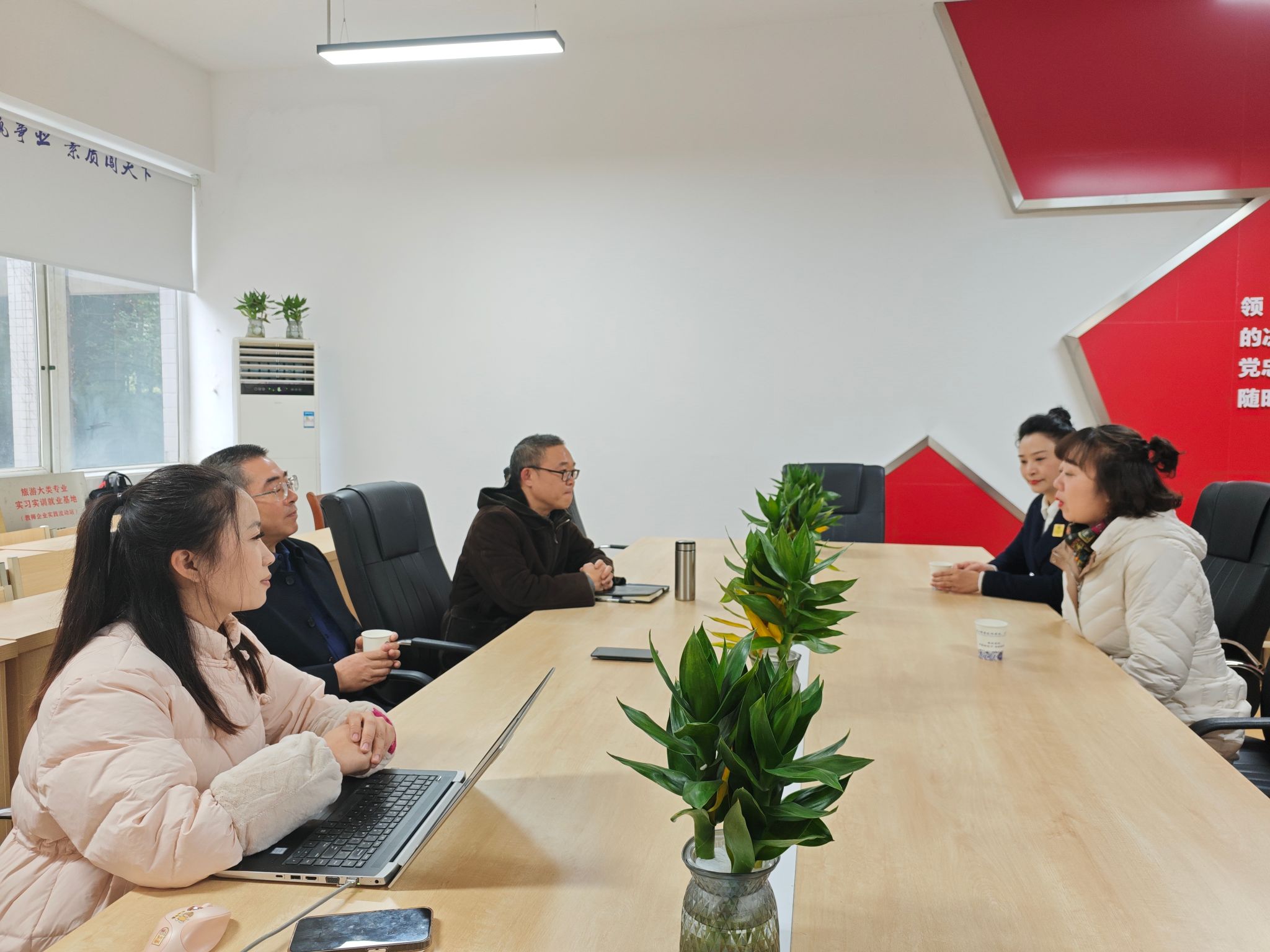 12月27日,眉山东坡国际大酒店安经理率队来校开展校企合作洽谈,学校党委委员、工会主席彭书君,旅游与财贸学院院长廖明江,学院党总支副书记袁娇,学工秘书林国曦参加洽谈会。