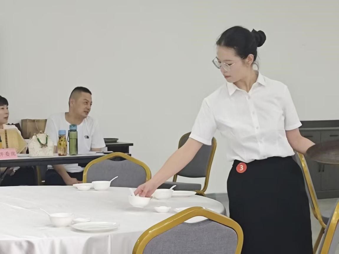 比赛现场,参赛选手身着工装,严格遵循操作规范完成餐具定位、餐巾折花等专业技能展示,在台面布局的对称度把控、餐巾造型的立体塑造等细节处理上,充分彰显扎实的专业功底。由专业教师组成的裁判组严格参照标准,从操作流程规范性、作业完成效率、服务场景美学呈现等维度进行量化评分。经过激烈比拼,数位专业能力突出的选手脱颖而出。他们将作为学校代表,参与省级职业院校技能竞赛,这些获奖选手后续将发挥示范引领作用,通过经验分享会等形式带动全体学生提升专业实践能力。