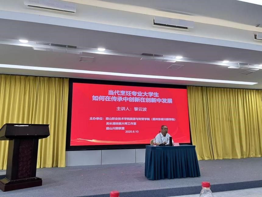 讲座内容获得师生高度认可,2024 级烹饪工艺与营养专业学生彭奉蛟说到:“黎老师分享的数字化运营案例极具启发性,让我深刻认识到传统川菜在新媒体时代的创新发展潜力。”在互动交流环节,针对“传统菜式融入现代健康理念的实践路径”“烹饪专业创业初期成本控制与创新平衡策略”等问题,黎云波结合行业实际,进行了细致解答,并鼓励学生秉持工匠精神传承烹饪技艺,以开拓创新的姿态推动行业发展。