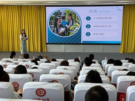 活动特邀彭山区行政审批局会计师彭蓓担任主讲嘉宾,她以行政单位实际工作案例为切入点,深入解析职场适应关键要点,为学生提供具有高度实操性的职业指导。会上,彭蓓结合自身从业经验,系统阐述了财务岗位的职业规范与业务流程,就学生关心的职场技能提升、职业发展规划等问题进行了细致解答。