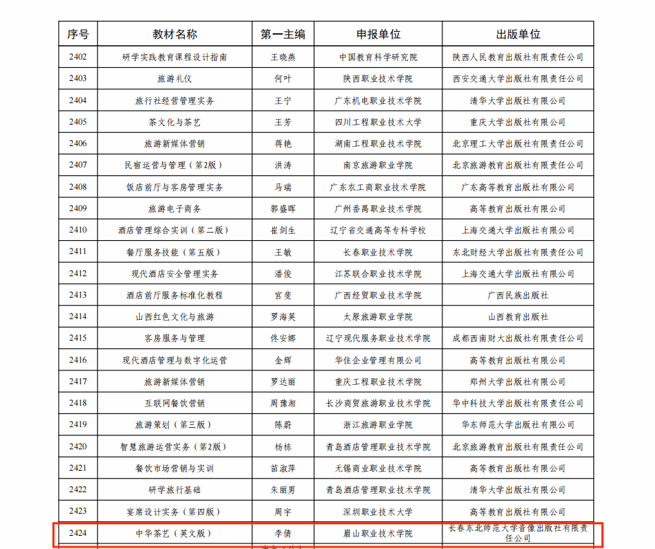 近日,教育部正式公布第二批“十四五”职业教育国家规划教材遴选结果,旅游与财贸学院李倩教授作为第一主编的《中华茶艺(英文版)》教材成功入选,对教师团队学术水平、专业能力及教材编写质量的权威认可,标志着我院在教材建设与国际化人才培养领域取得重大突破性成果。