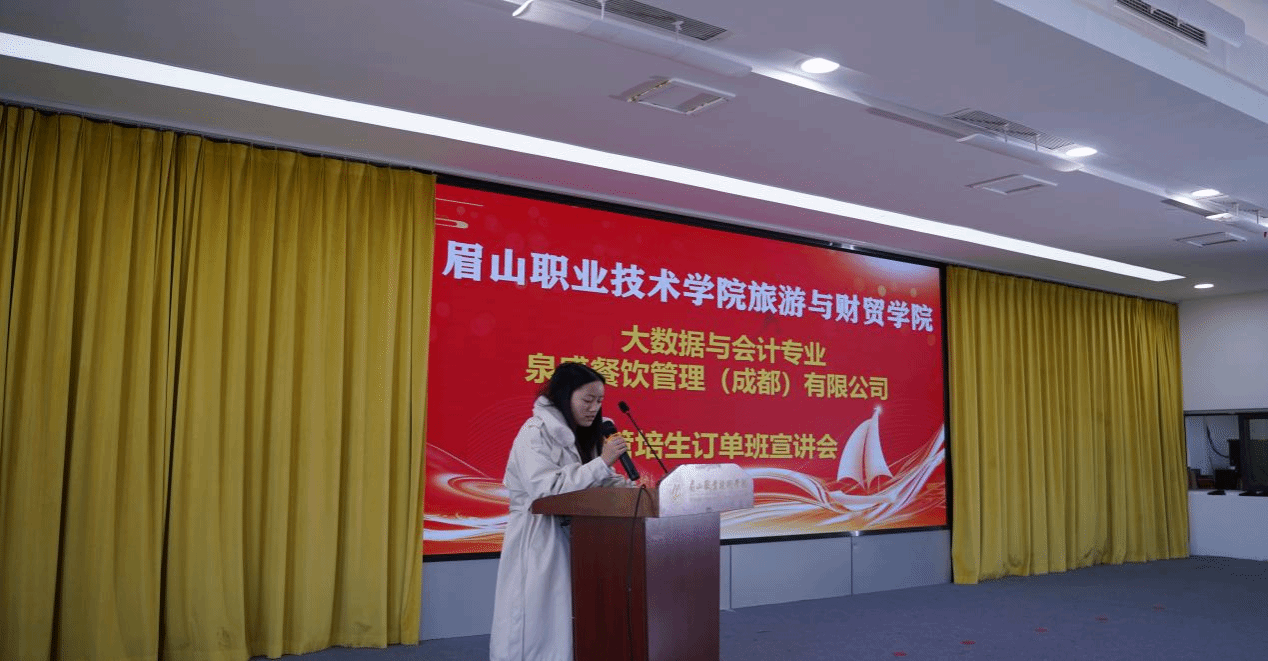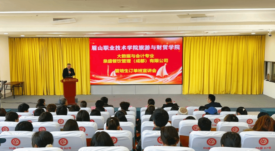 11 月 19 日,旅游与财贸学院大数据与会计专业在招生就业中心二楼举办“泉盛餐饮管理(成都)有限公司管培生”订单班宣讲会。学院院长廖明江、大数据与会计专业全体师生以及泉盛餐饮管理(成都)有限公司企业负责人及代表共同参会,会议由专业负责人魏秀云主持。