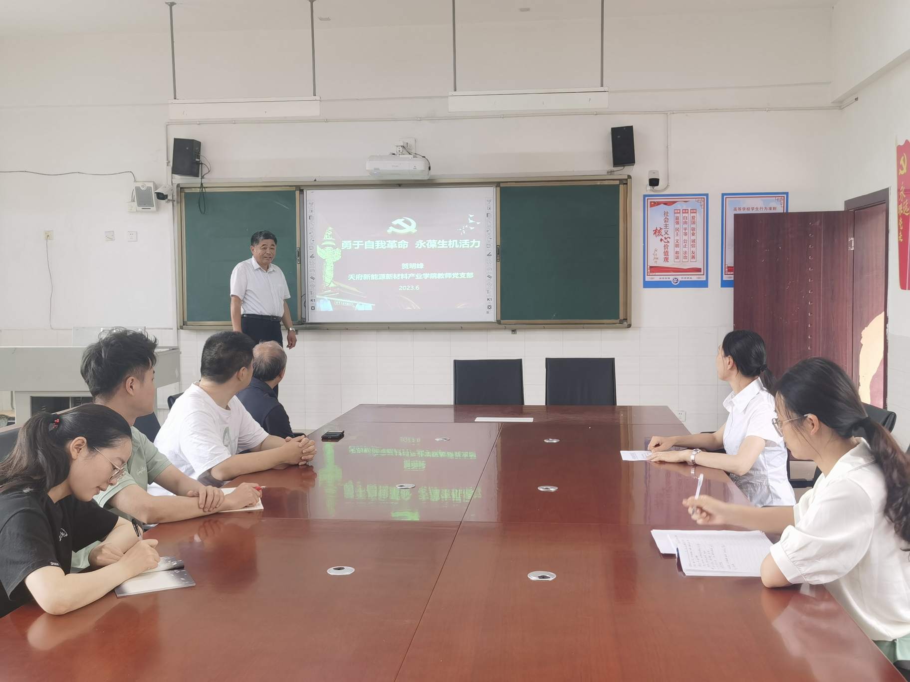 活动中,天府新能源新材料产业学院教师党支部书记贺明峰以“勇于自我革命,永葆生机活力”为题,从中国共产党勇于自我革命的重大意义、精髓要义和实践要求三个方面,带领全体党员教师共同学习了习近平总书记关于《党必须勇于自我革命》的论述,并就“青年党员如何开展自我革命”、“如何增强自我革命的自觉与勇气”两个问题进行了分享,深化了党员同志对自我革命和永葆党的先进性的认识。