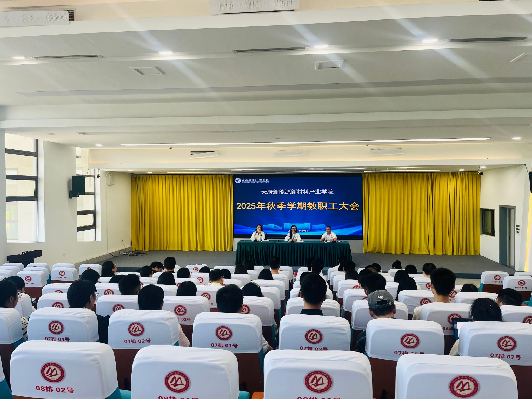 9月19日,天府新能源新材料产业学院在学校招生就业中心二楼会议室召开2025年秋季学期教职工大会。会议由学院副院长(主持工作)王素君主持,学院党总支副书记(主持工作)刘菲、副院长陈婷婷出席会议。
