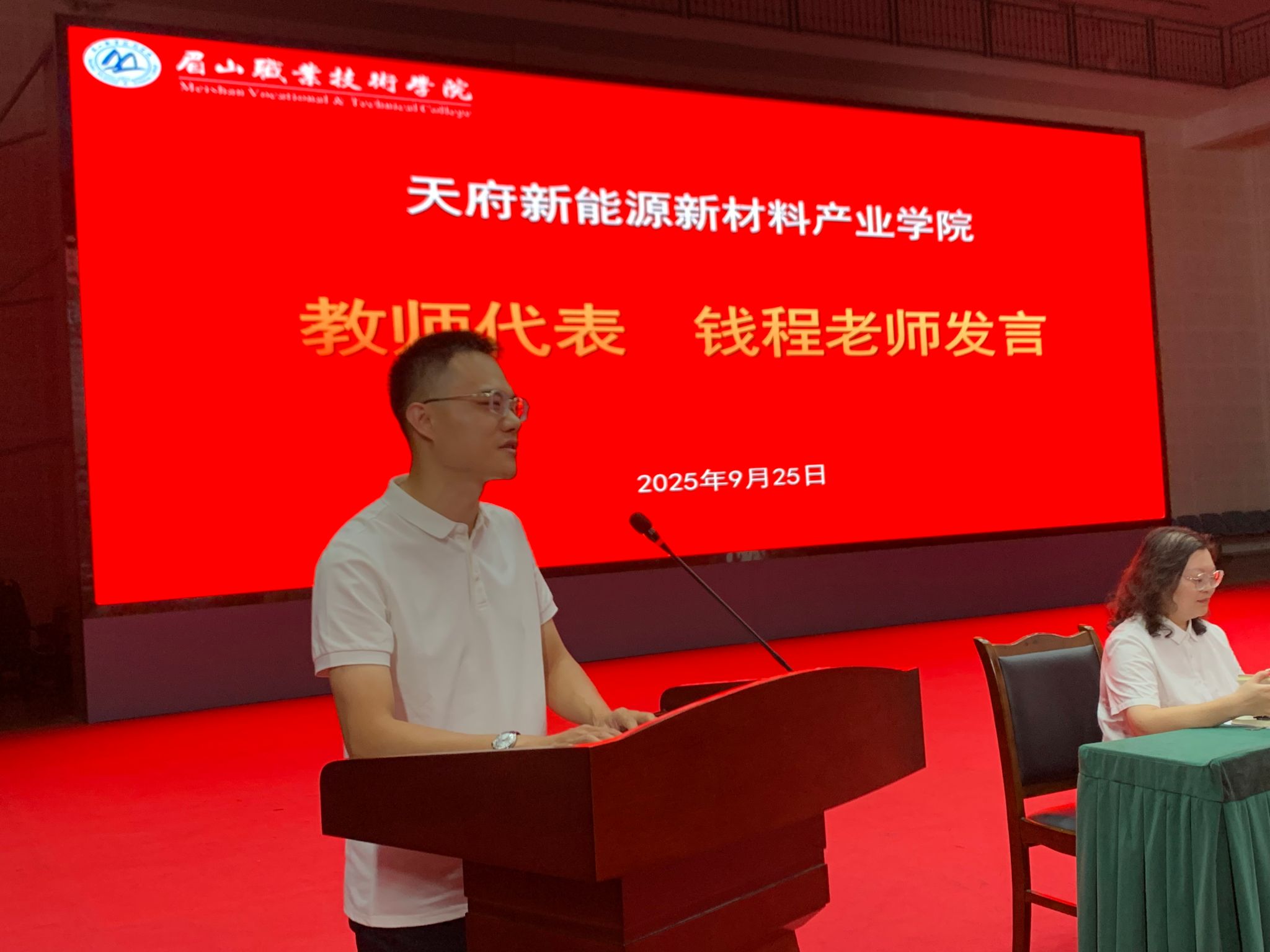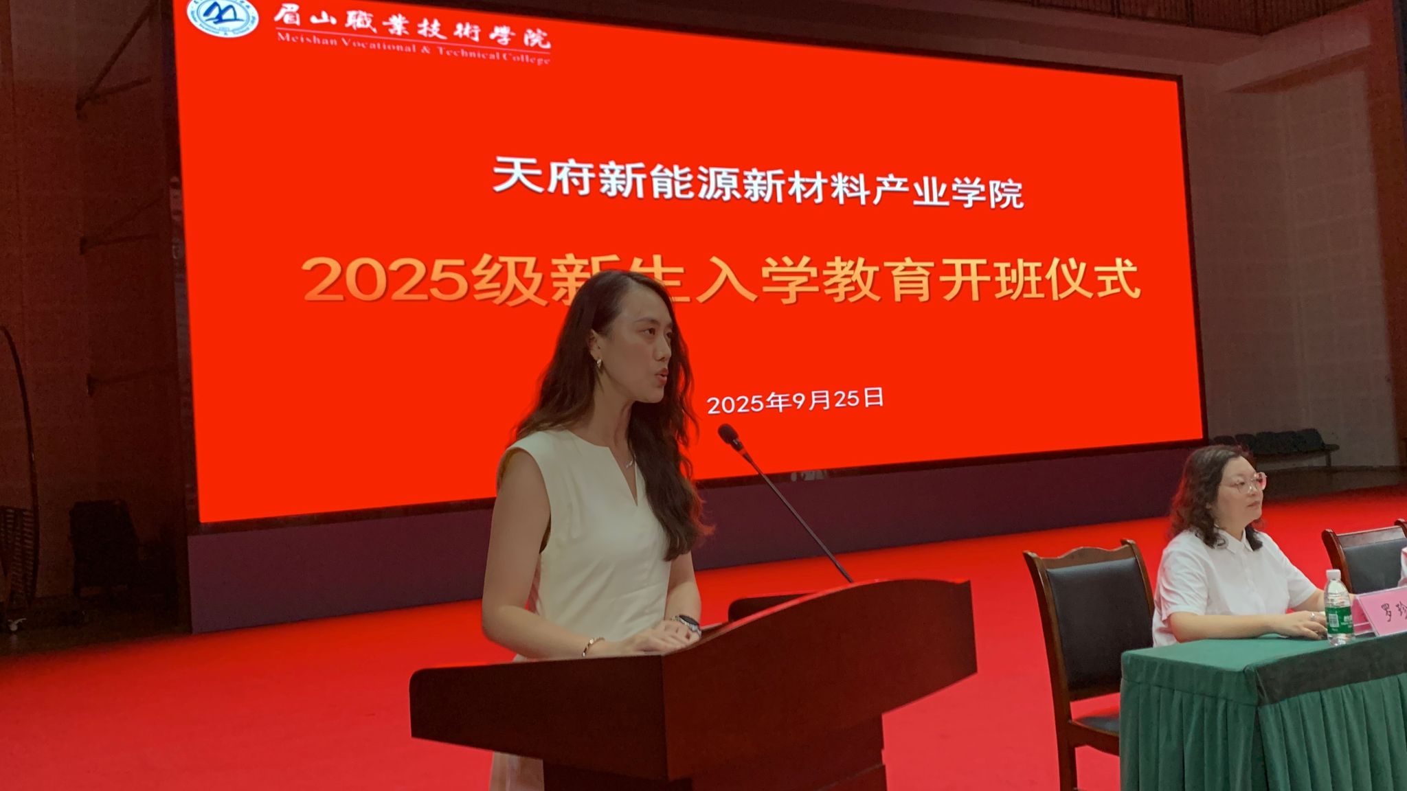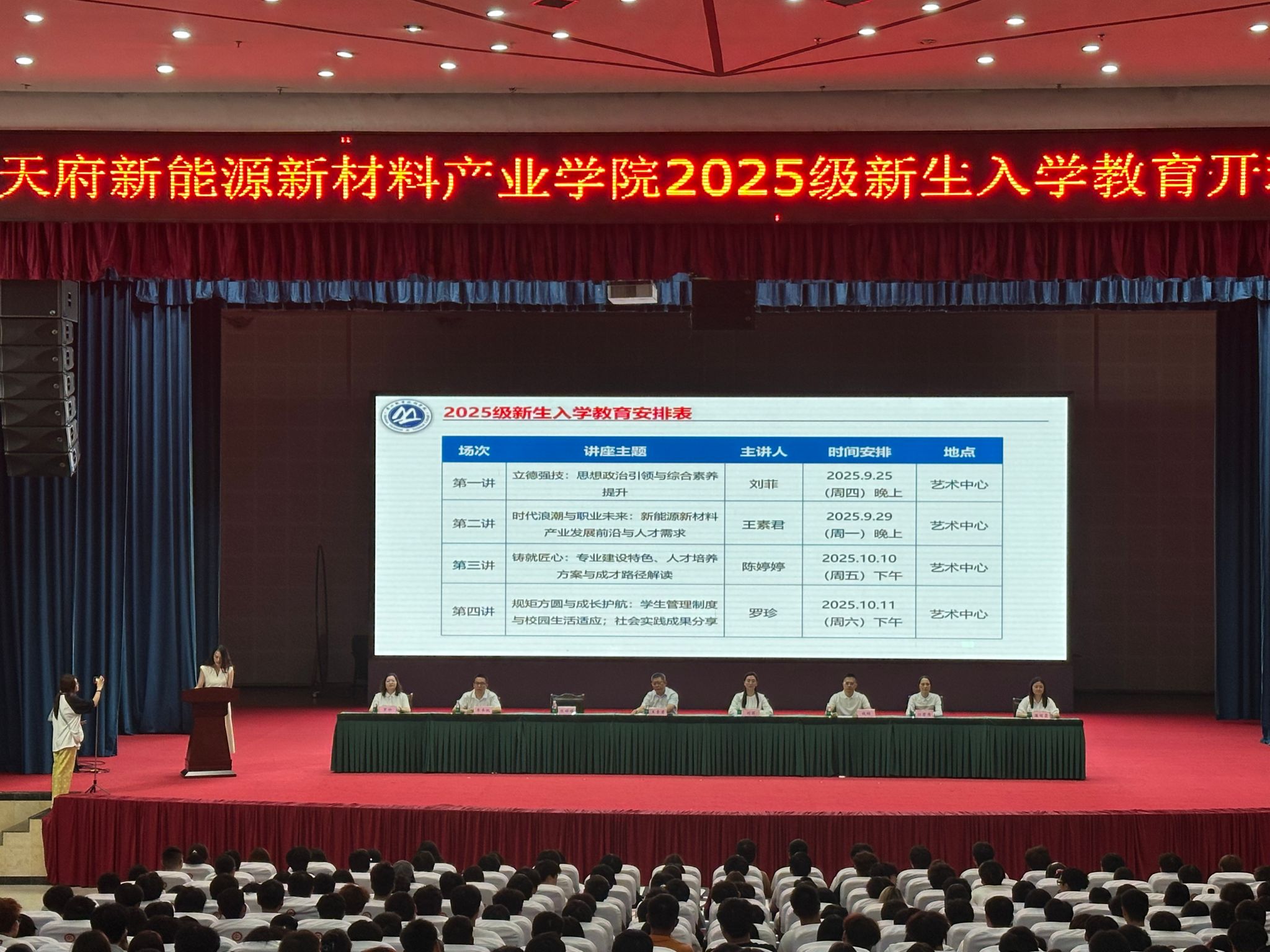 9月25日,天府新能源新材料产业学院2025级新生入学教育开班仪式在学校艺术中心举行。学院党政领导班子成员参加开班仪式,开班仪式由副院长陈婷婷主持。