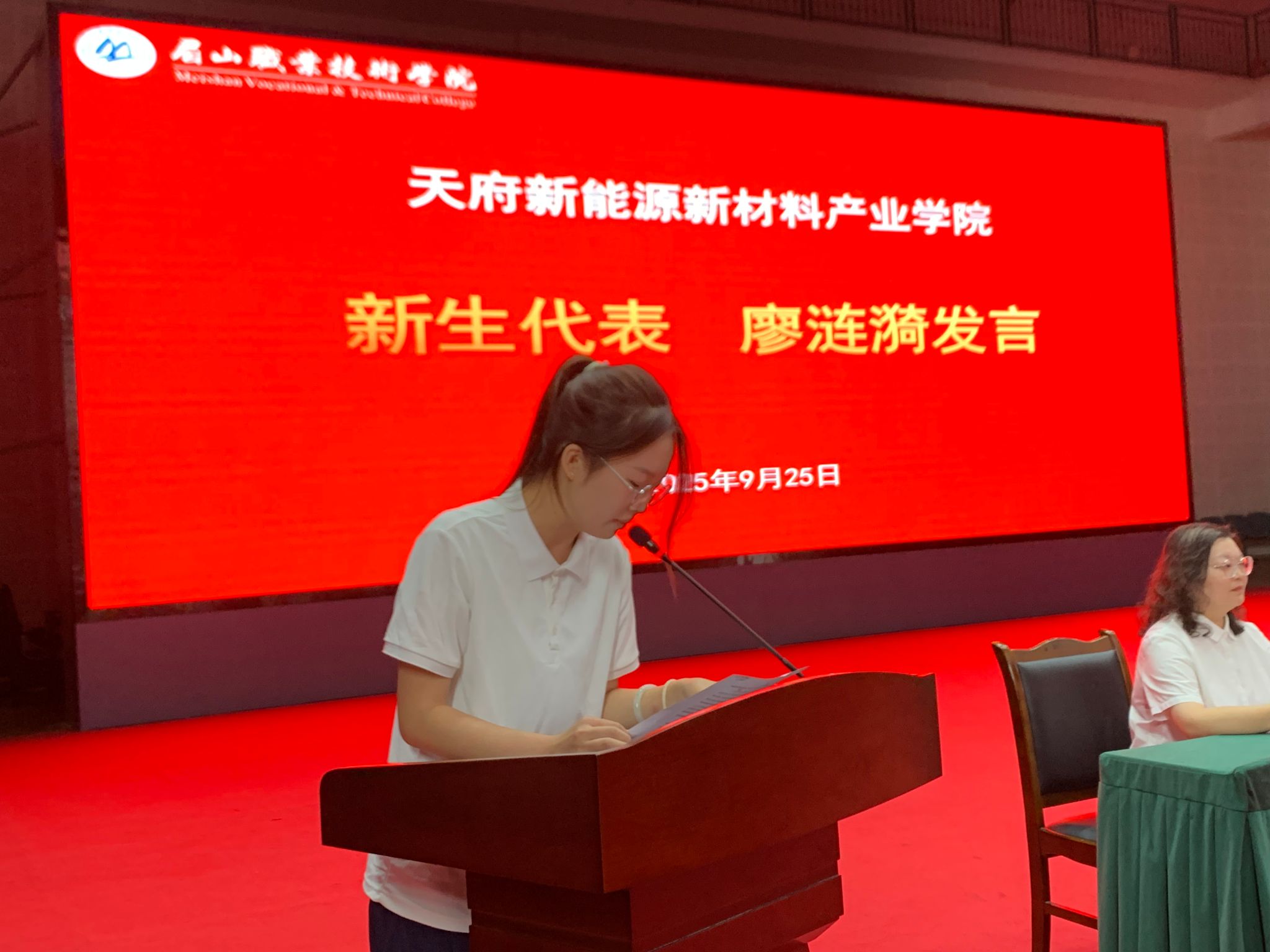 2025级新能源材料应用技术专业廖涟漪同学代表新生上台发言。她表达了对大学生活的无限憧憬与坚定信念,代表全体新生承诺将珍惜宝贵的学习机会,刻苦钻研专业知识,努力提升综合素养,立志成为新能源新材料领域的高技能人才,为服务国家战略和区域经济发展贡献青春力量。