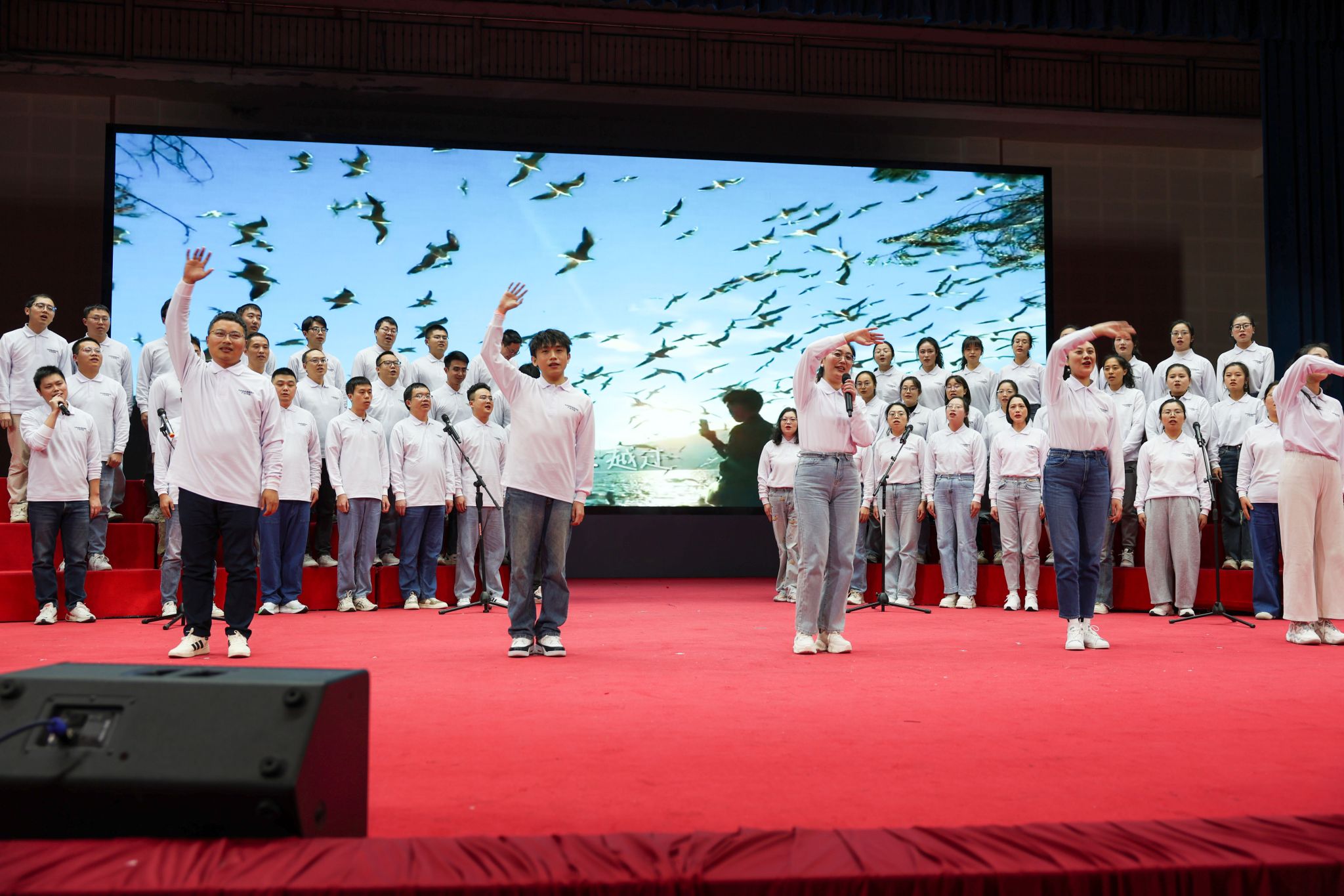 晚会在激情洋溢的开场舞《青春律动》中拉开帷幕。学院党总支副书记刘菲发表致辞,回顾了“一二·九”运动波澜壮阔的历史,寄语广大青年学子要继承光荣传统、肩负时代使命,在国家新能源新材料战略发展的关键领域中,将爱国之情、报国之志转化为刻苦钻研、精进技能的实际行动,努力成长为有理想、敢担当、能吃苦、肯奋斗的新时代优秀青年。致辞结束后,学院全体教师集体献唱《亲爱的你啊》,用温暖而真挚的歌声,表达了对学生的殷切期望与深厚情谊,生动展现了师生同心、协力前行的学院风采。