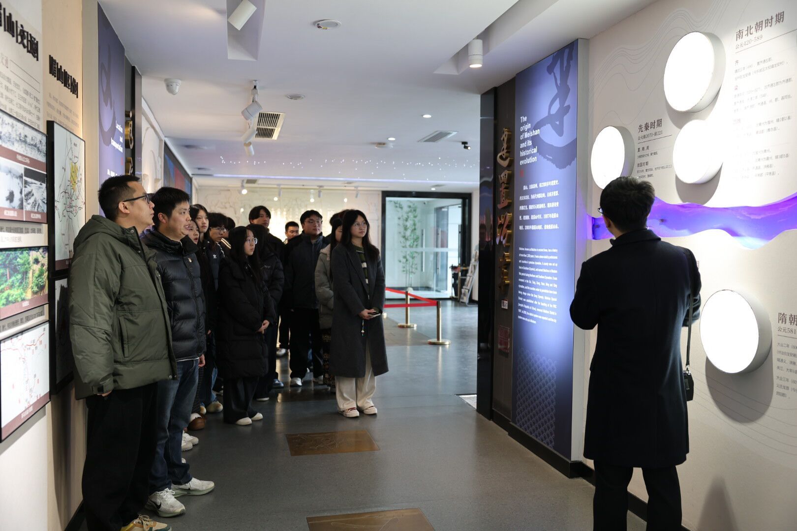 在讲解员的引导下,师生党员与团学骨干一同参观了文化广场、序厅、党史馆及方志馆。党史馆系统展现了中共眉山地方党组织在革命、建设、改革与新时代各个时期的奋斗历程;方志馆则生动呈现了眉山深厚的自然资源、人文积淀、历史变迁与当代发展成就。通过实地学习,大家共同回顾了眉山2300多年的悠久历史,深切感受到革命先辈的奋斗精神,也对眉山的发展脉络与未来前景有了更全面的认识。