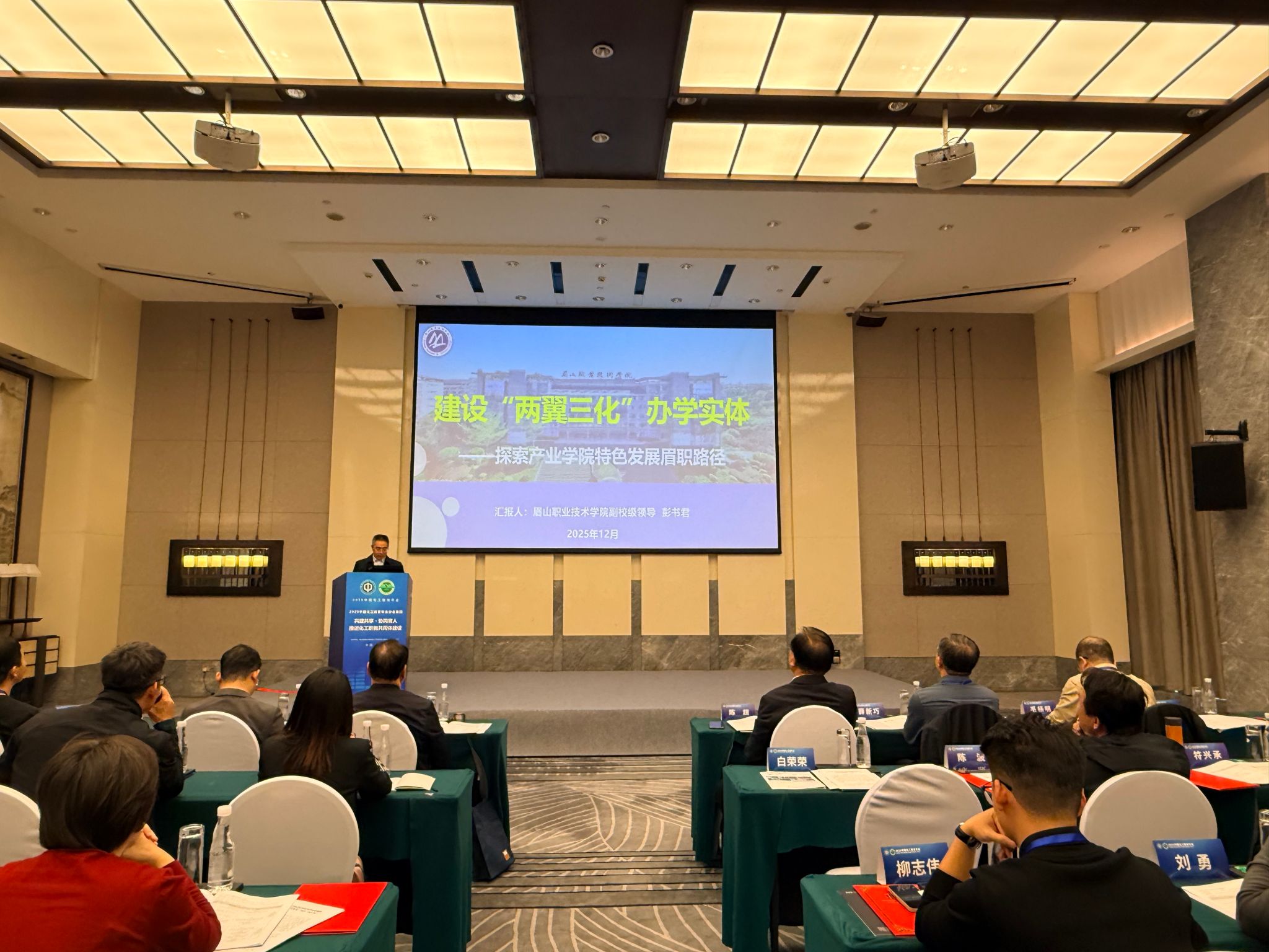 彭书君在共建共享·协同育人,推进化工职教共同体建设主题分会场作《建设“两翼三化”办学实体 探索产业学院特色发展眉职路径》主题报告,系统介绍了眉山职业技术学院以“市域产教联合体”与“产教融合共同体”为两翼,以“平台集成化、机制实体化、教学数字化”为三化,推动产业学院从组织架构到运行模式全面升级的创新实践。 他结合学校建设天府新能源新材料产业学院、“天府粮仓”现代农业产教融合共同体以及眉山市新能源新材料融合创新中心等具体案例,阐释了如何通过生态重构、平台打造、机制创新与数字赋能,实现教育链、人才链、产业链与创新链的深度融合。报告生动展现了学校在破解产教融合瓶颈、提升人才培养适应性、增强服务地方产业能力方面的有效探索,为职业教育高质量发展提供了具有参考价值的“眉职方案”。