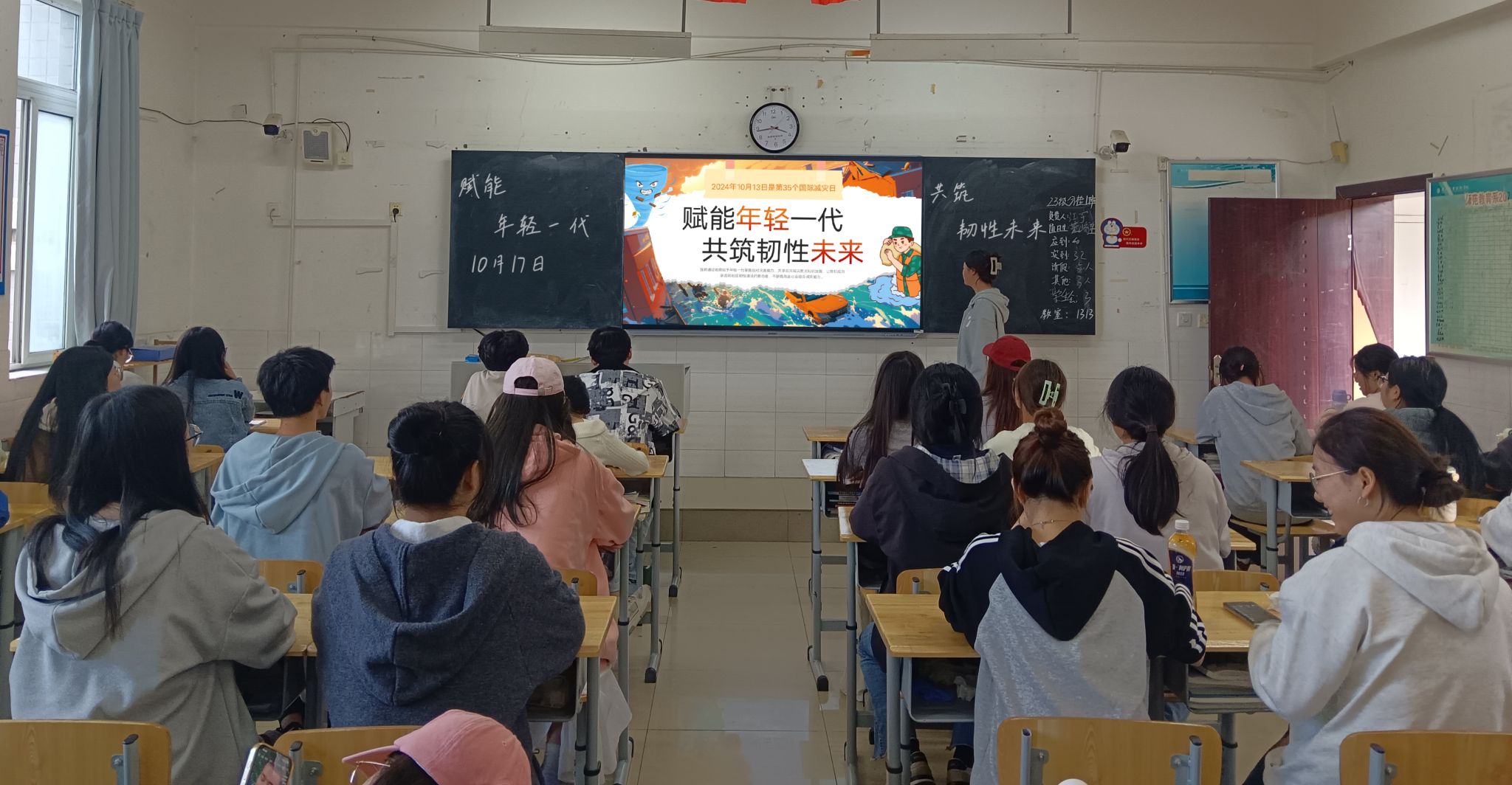 活动中,各班紧扣防灾减灾救灾主题,以“国际灾害日”的设立、自然灾害的含义、灾害特征和影响以及灾害应对为内容,通过讲解防灾减灾真实案例、播放防灾减灾相关视频等形式,增强了全体师生的安全意识,提高了面对灾害随机应变的能力。