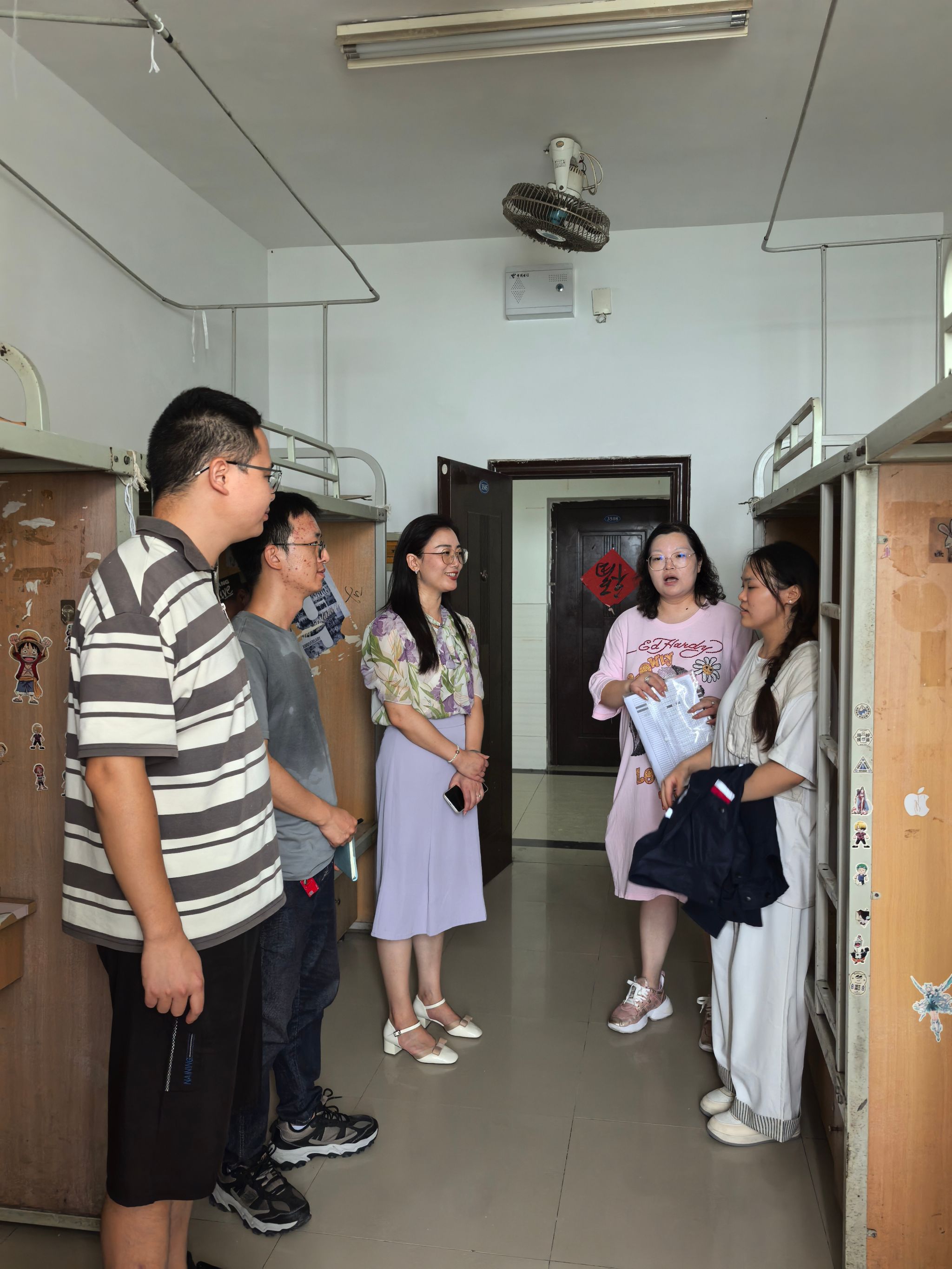 现场部署会上,刘菲强调要坚守“流程标准化、服务精细化”原则,清晰划分报到当日资料核验、宿舍引导、志愿者服务等各环节职责。排查工作重点核查教室消防设施是否完好、应急通道是否畅通,细致检查寝室电路安全及有无违规电器存放等情况。针对排查中发现的窗台杂物堆积、个别消防指示灯故障等问题,现场整改,明确责任人和整改时限,确保各类隐患当日整改到位,让迎新工作既有温度又有保障。