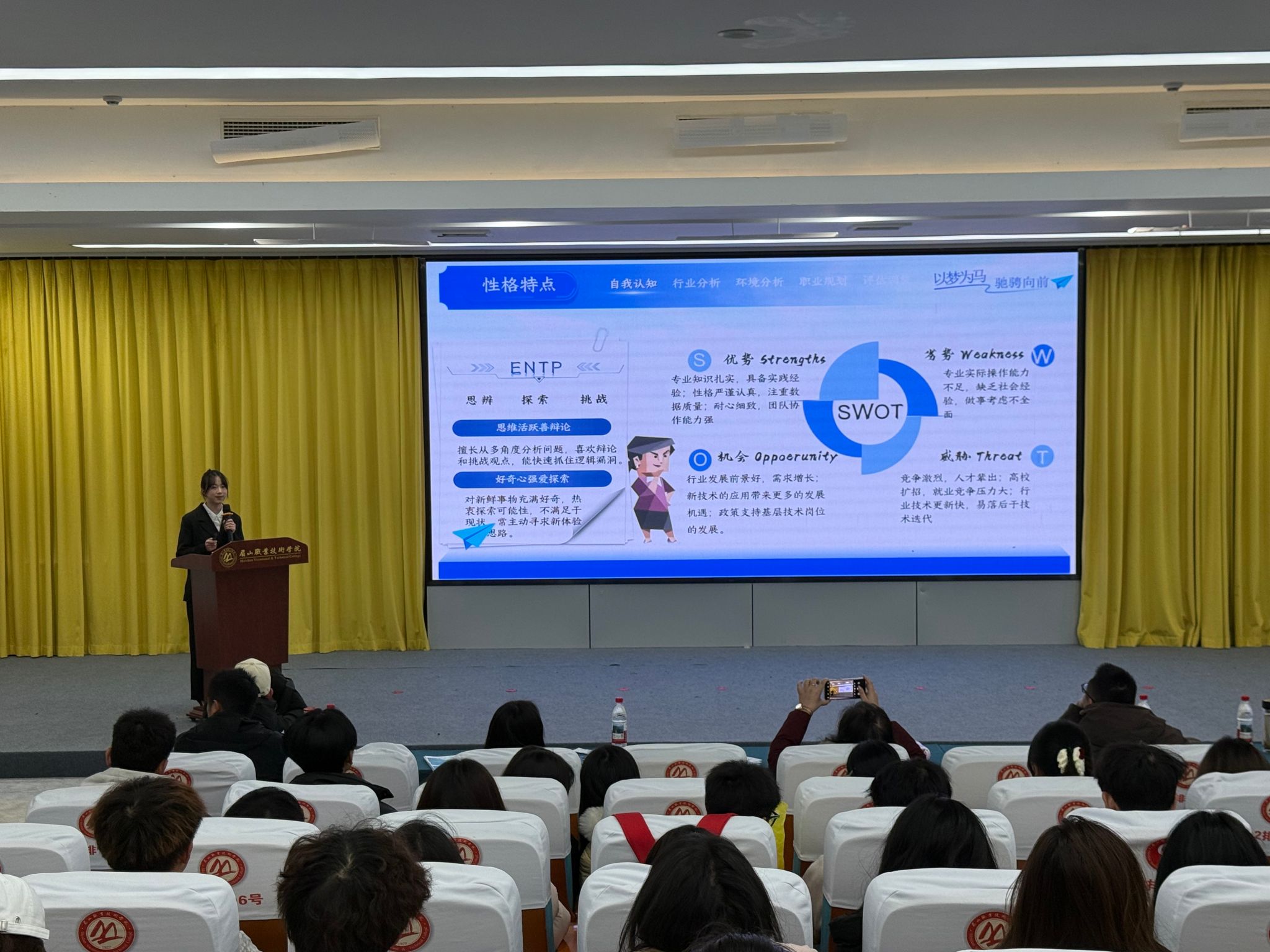 11月26日,天府新能源新材料产业学院“筑梦青春志在四方,规划启航职引未来”大学生职业规划大赛在学校招生就业中心二楼报告厅顺利举行。学院党总支组织员李卓桃、学工秘书罗珍及优秀毕业生代表黄雨芳等担任评委,全体学生管理人员与200余名学生现场观摩,共同见证学子们的职业畅想与成长蓝图。
