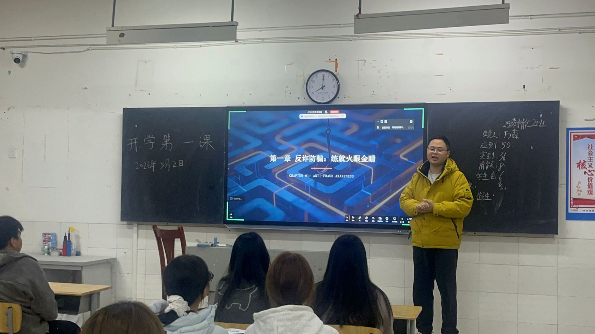在“开学第一课”上,各辅导员结合寒假期间高发的电信网络诈骗案例,深入剖析刷单返利、冒充客服、虚假贷款等常见诈骗手段,详细讲解“不轻信、不转账、不透露”的防骗原则,引导学生增强识诈防诈“免疫力”。在食品安全教育环节,辅导员针对春季传染病高发特点,重点强调外卖食品风险、个人卫生习惯养成及校园食堂规范就餐的重要性,提醒学生把好“病从口入”关。消防安全教育中,辅导员结合学生宿舍、实验室等场所的防火要点,系统讲解违规电器禁用、充电设备规范使用及火灾应急逃生技巧,并通过播放火灾警示片强化警示效果。