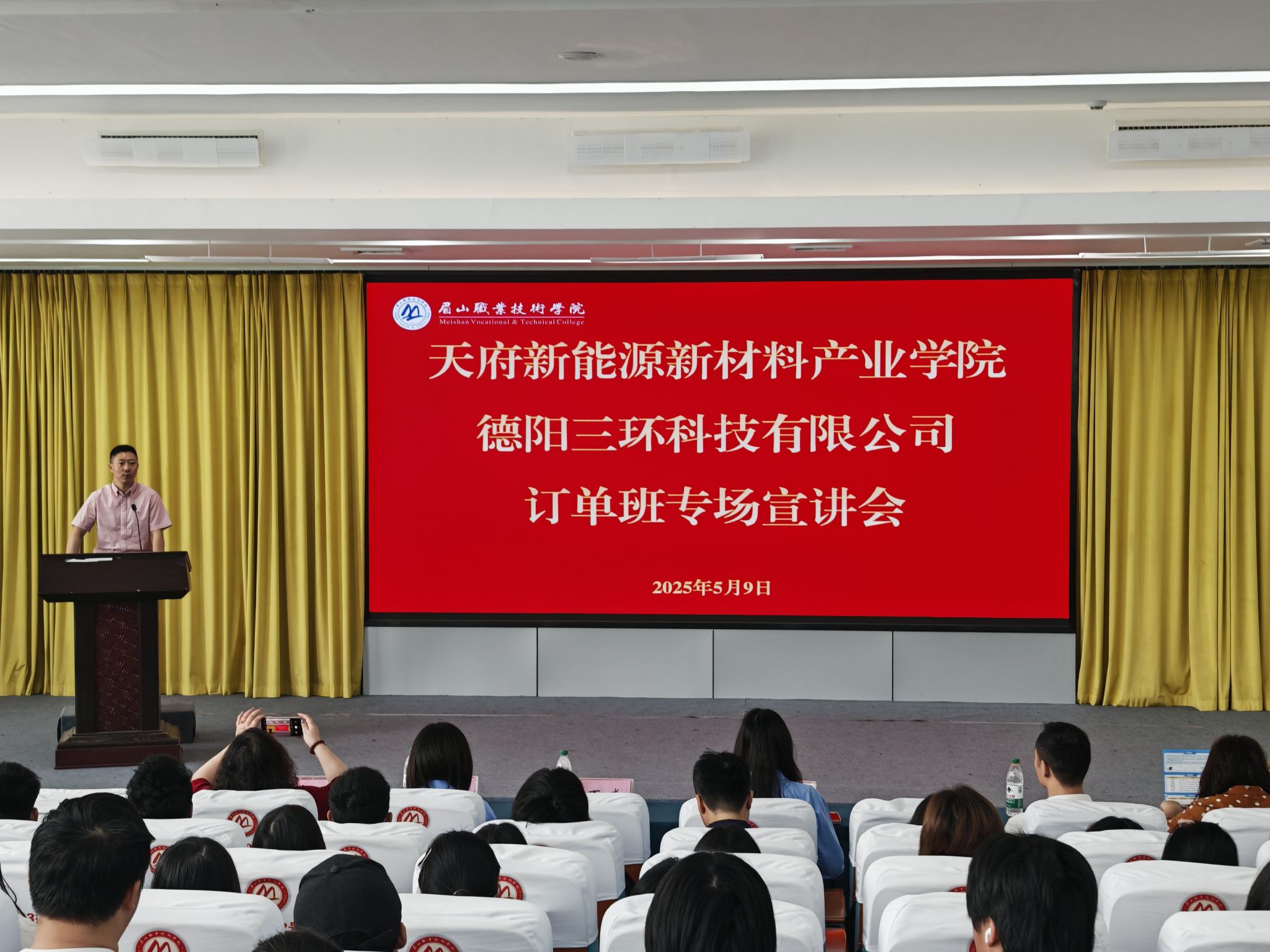 5月9日,天府新能源新材料产业学院在学校招就中心二楼会议厅开展德阳三环科技有限公司订单班专场宣讲会。学校党委委员、宣传统战部部长、产业学院党总支书记丁盛,德阳三环科技有限公司人资部经理刘幸参加会议并讲话,会议由学工秘书罗珍主持。