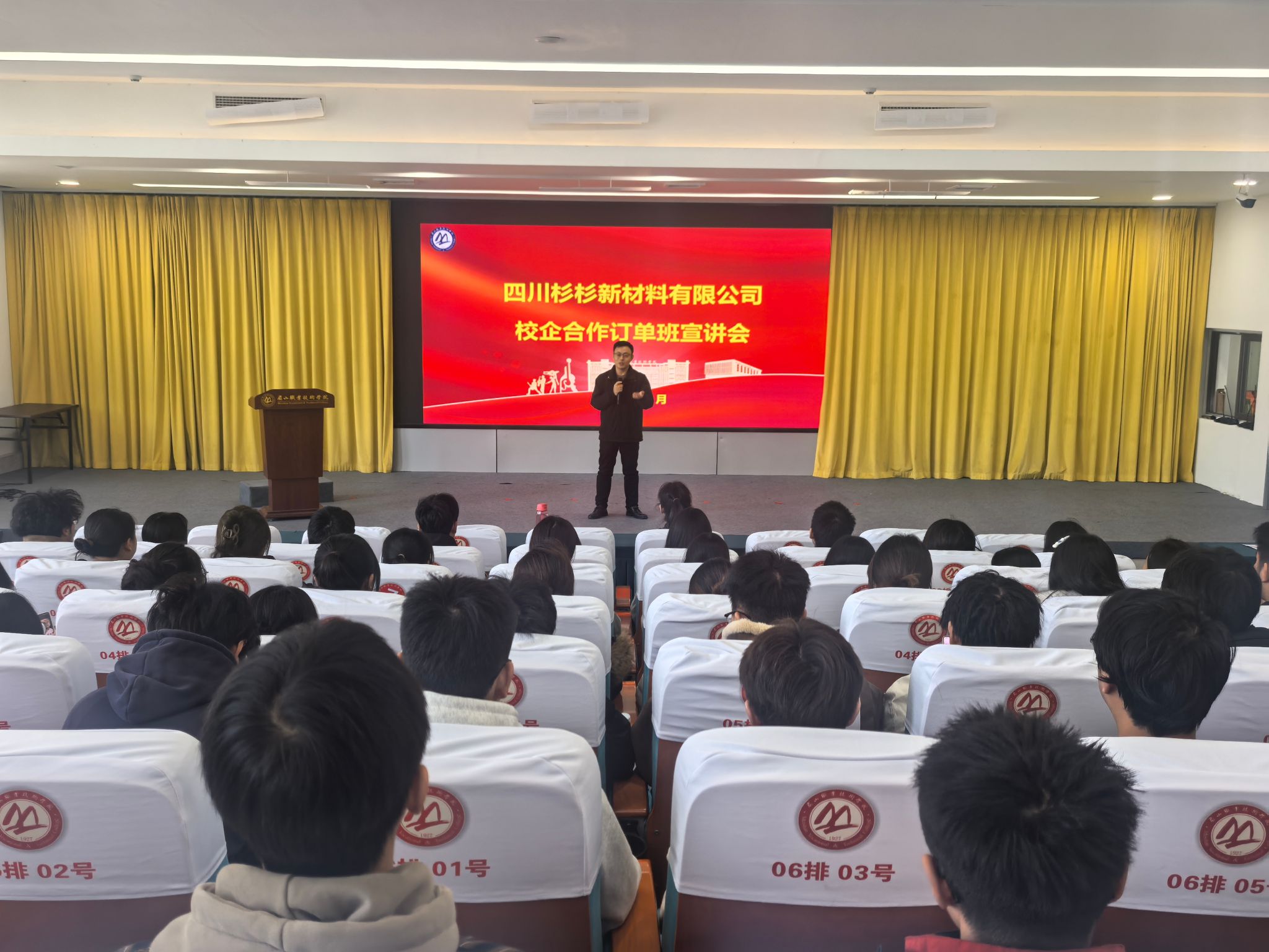 11月19日,天府新能源新材料产业学院在学校招就中心二楼报告厅召开四川杉杉新材料有限公司校企合作订单班宣讲会。学院党总支副书记刘菲出席会议,学工秘书罗珍主持会议,2024级应用化工技术、分析检验技术专业等100余名同学参加宣讲会。