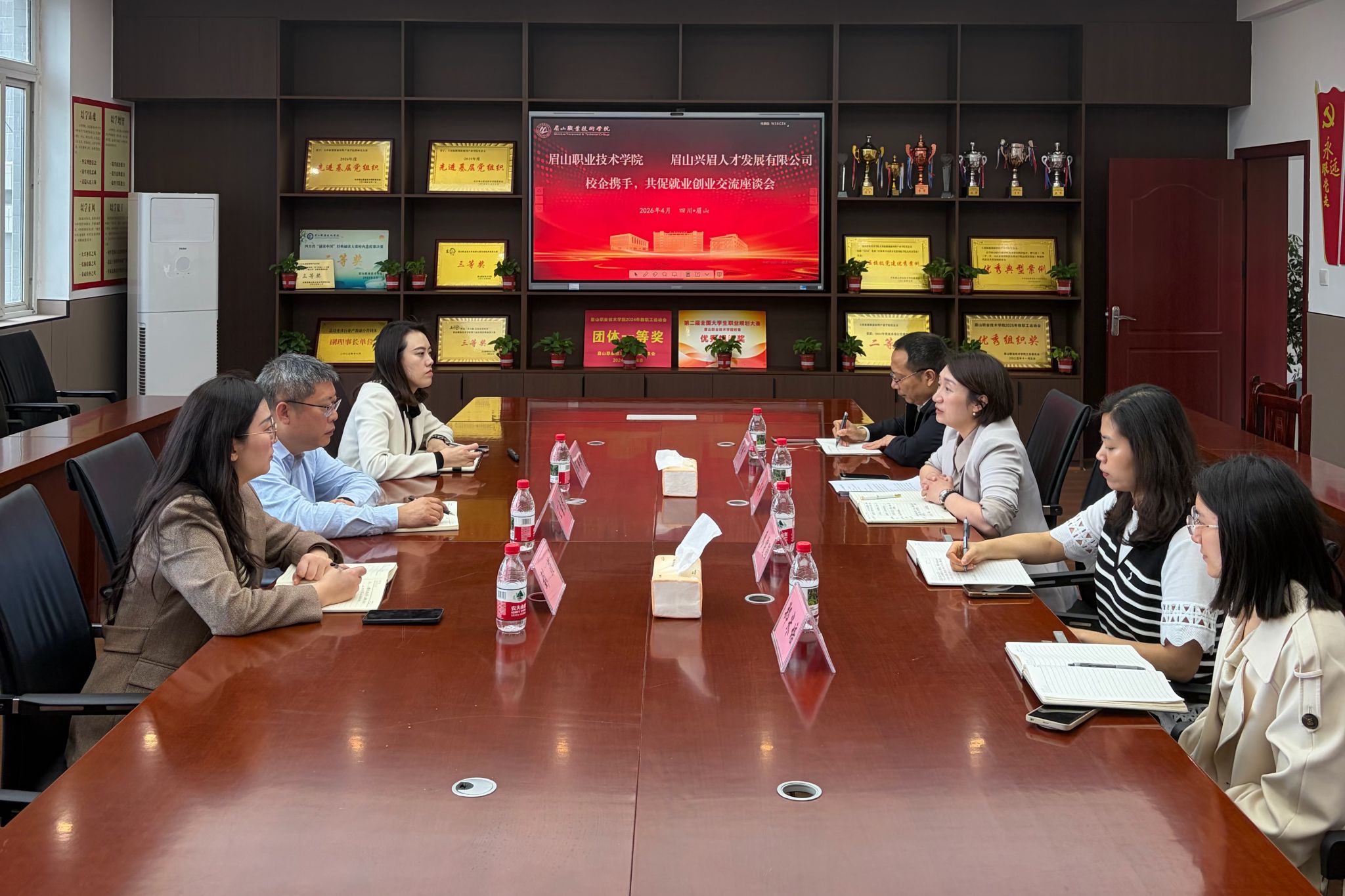 产业学院副院长陈婷婷,眉山兴眉人才发展有限公司人力资源总监范域广、就业创业事业部副部长廖雯颖、就业创业事业部项目经理郑米培参加座谈会。
