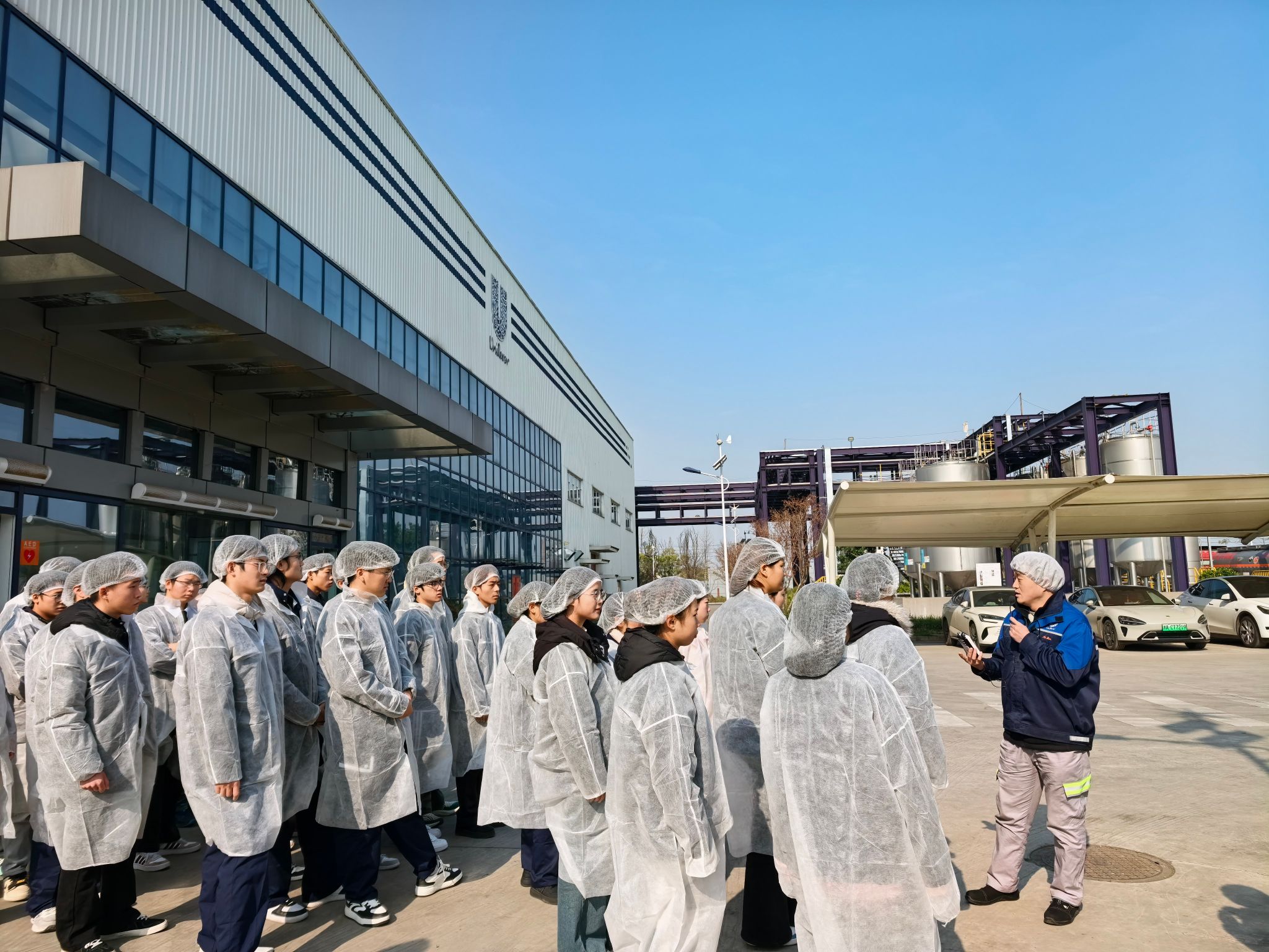 在企方人员引导下,师生依次参观了生产车间、产品检测中心等核心区域。讲解过程中,负责人依托实际生产线,详细阐释了精细化工产品从原料处理、反应合成到提纯检测的全流程工艺,同时介绍了自动化生产设备的运行逻辑与绿色工艺的实施情况。学生们全程专注聆听、积极提问,围绕生产工艺细节与质量控制标准等问题与企业人员展开交流,现场互动热烈,体现出浓厚的求知氛围。