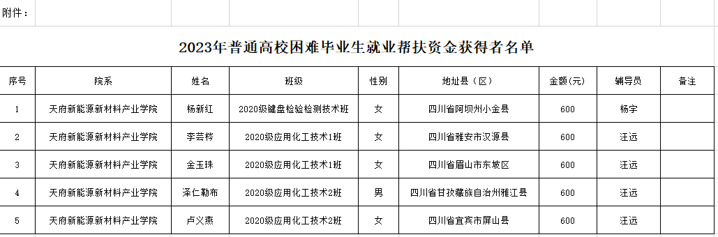根据《四川省教育厅关于做好2023年普通高校困难毕业生就业帮扶经费申报工作的通知》相关要求,经学生个人申请,各班评议小组评定,辅导员初审并在全班范围内公示无异议,学院复核,评选出杨新红等5名学生为我院2023年普通高校困难毕业生就业帮扶资金获得者。(详见附件)