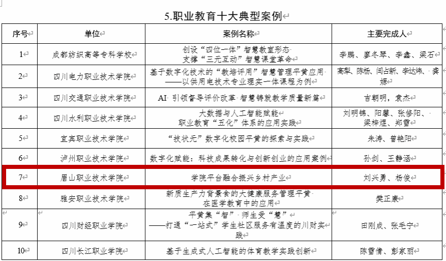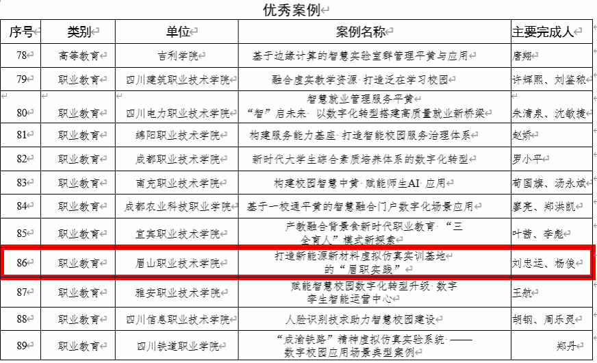 四川省教育厅公布了2024年数字校园应用场景案例评选结果,经各地各校推荐、专家组评审,评选出2024年数字校园应用场景典型案例50个、优秀案例97个。我校现代农业学院教师伏晓科撰写的《学院平台融合振兴乡村产业》入选“职业教育十大典型案例”,天府新能源新材料产业学院教师刘忠运撰写的《打造新能源新材料虚拟仿真实训基地的“眉职实践”》入选“优秀案例”。