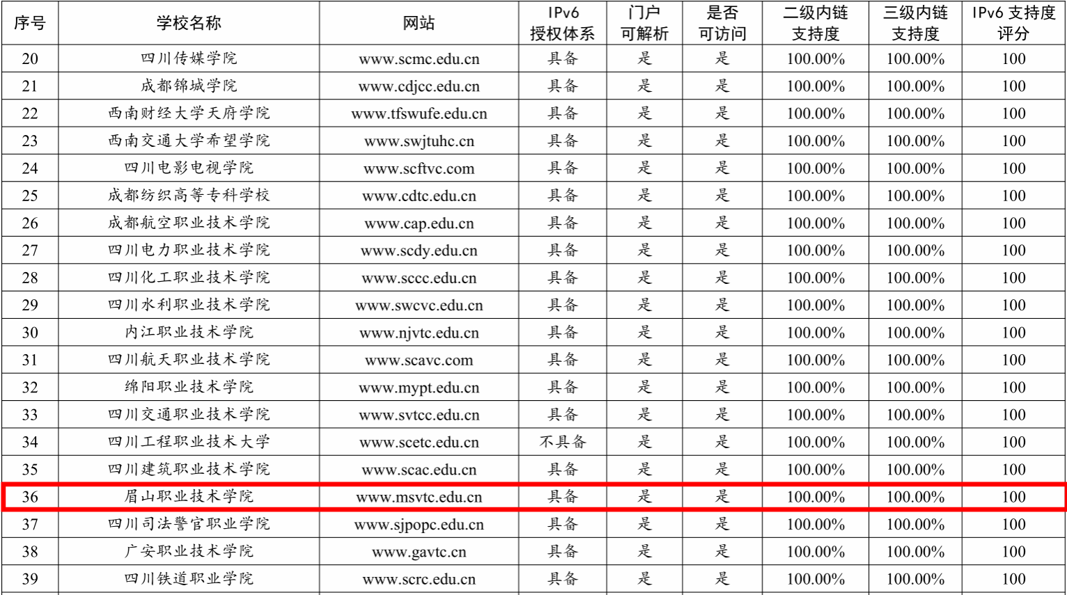 四川省教育厅发布了2024年第四季度对全省高校门户网站IPv6支持度的检测结果,在全省139所高校中,有68所表现优秀(支持度评分为100分)。我校继续保持门户网站对IPv6完全支持,支持度评分为100分,被省教育厅确定为优秀。