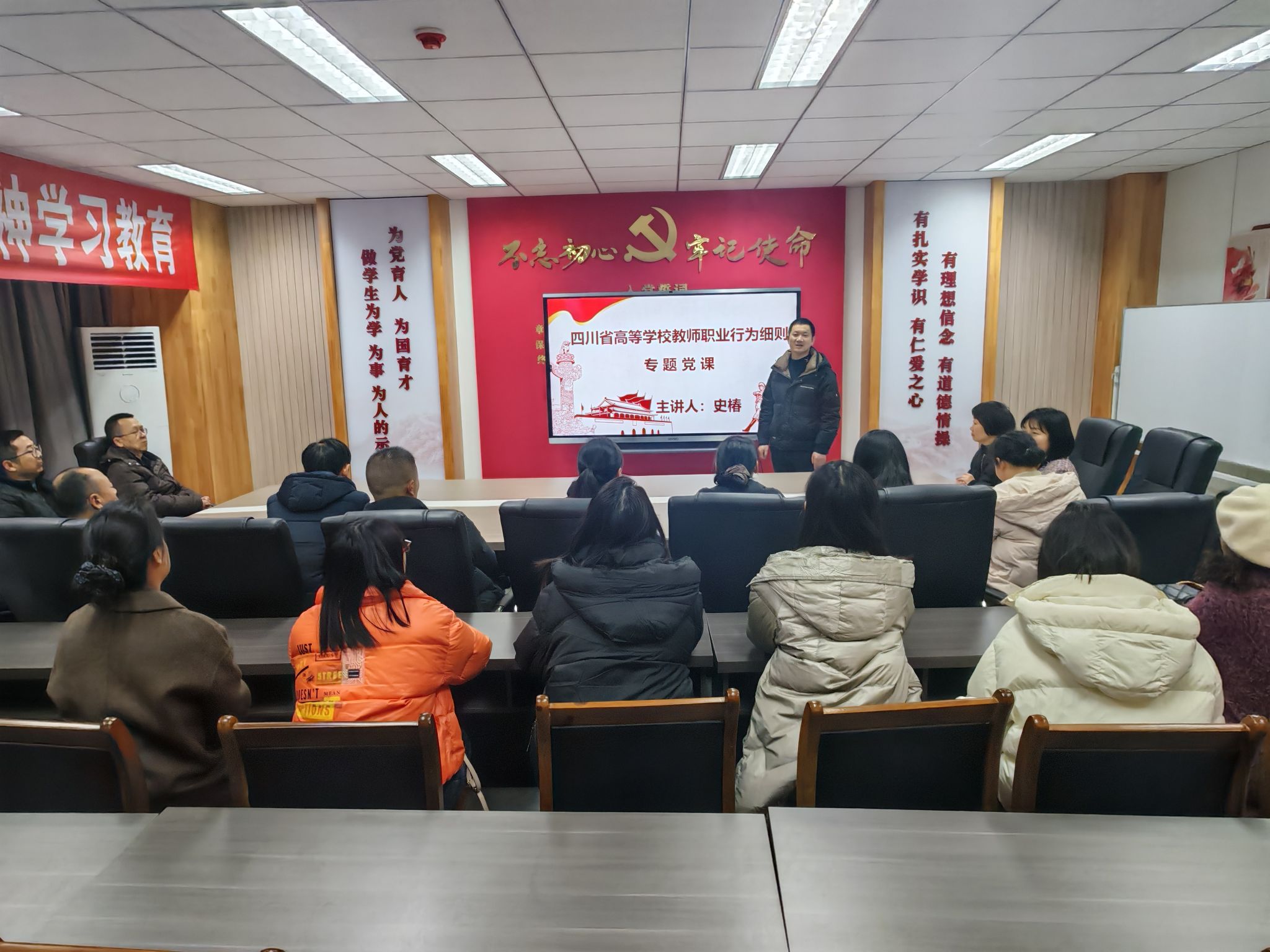 12月23日,通识教育学院党总支组织委员史椿在7309党员活动室为全体党员讲授“深学细悟《四川省高等学校教师职业行为细则》 争做新时代‘四有’好老师”专题党课。通识教育学院党总支全体党员参加此次专题党课。