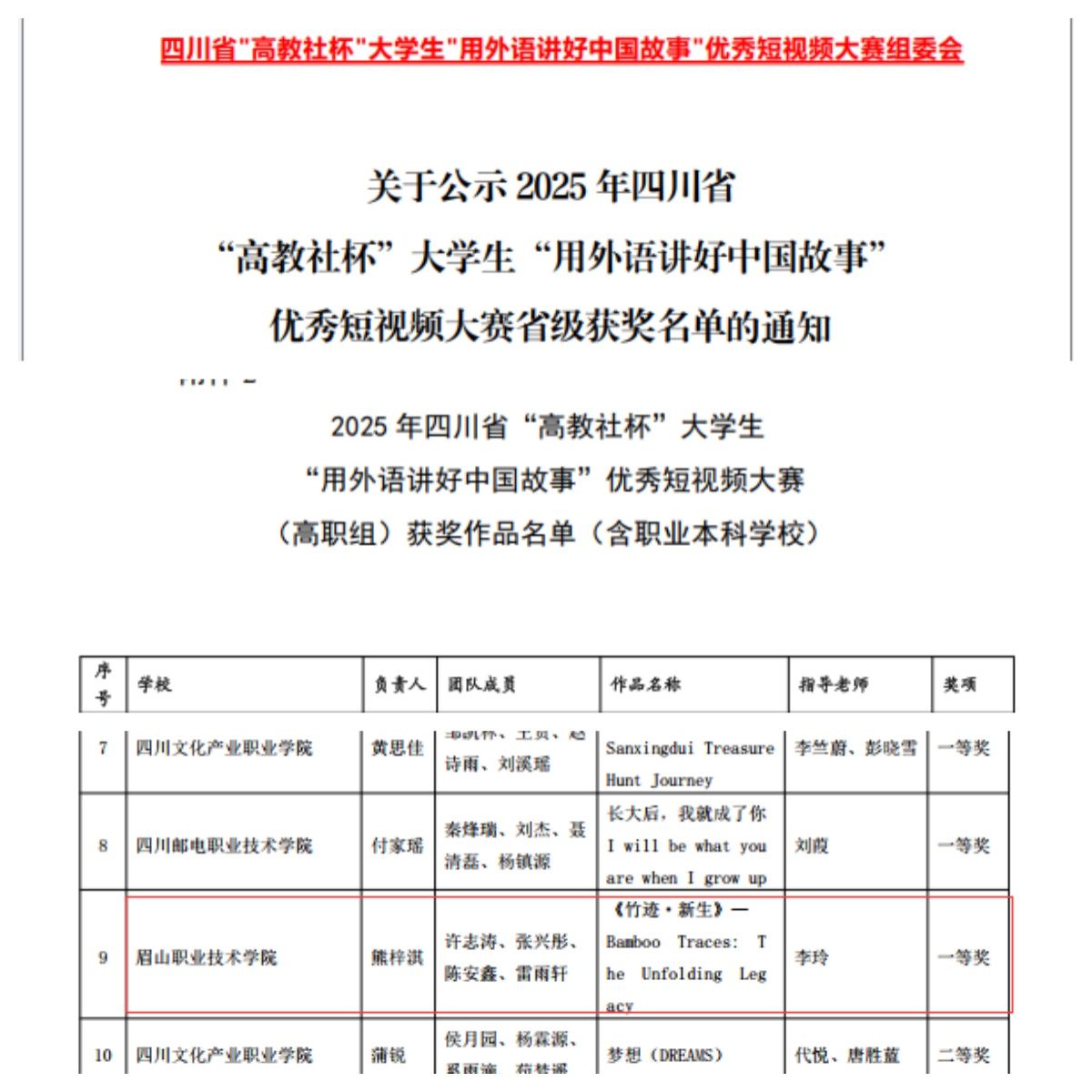 8月25日,2025年四川省“高教社杯”大学生“用外语讲好中国故事”优秀短视频大赛获奖名单公示,由通识教育学院李玲老师指导,熊梓淇同学担任负责人,许志涛、张兴彤、陈安鑫、雷雨轩作为团队成员共同完成的作品《竹迹·新生》(Bamboo Traces: The Unfolding Legacy)以第9名的成绩荣获一等奖并成功入围国赛选拔赛。