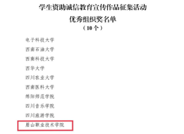 近日,四川省教育厅公布了2020年全省高校学生资助诚信教育主题活动宣传作品评选结果,我校选送短片类作品《未“诚”想》《“诚”长》获短片类三等奖、《点石成金,立人为诚》获短片类作品优秀奖,学校获学生资助诚信教育宣传作品征集活动优秀组织奖。
