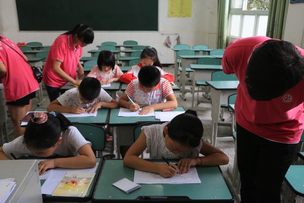 (志愿者在给小朋友进行作业辅导)