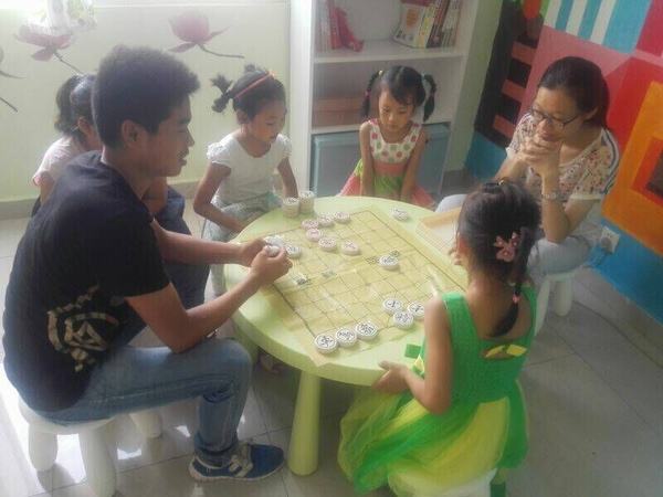 (陈杰同学在与小朋友下象棋)