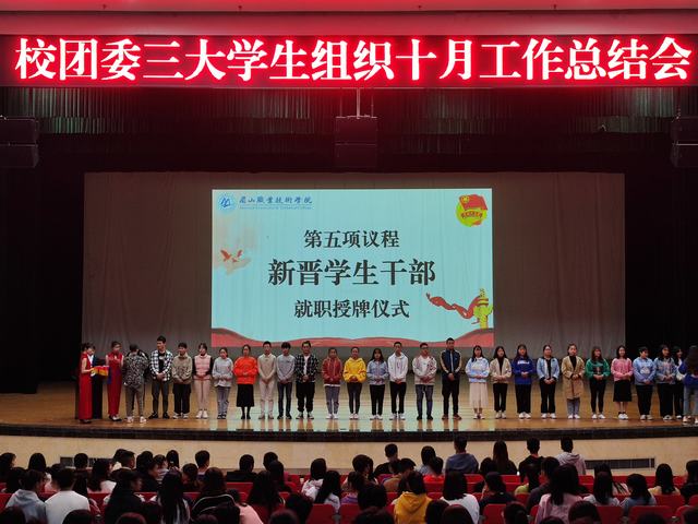 11月3日,眉山职业技术学院“团、学、联”三大学生组织十月全体例会在艺术中心召开,校团委负责人李孝蓉及团委老师李青青出席本次会议,会议由校学生会干事韩玉婷主持。
