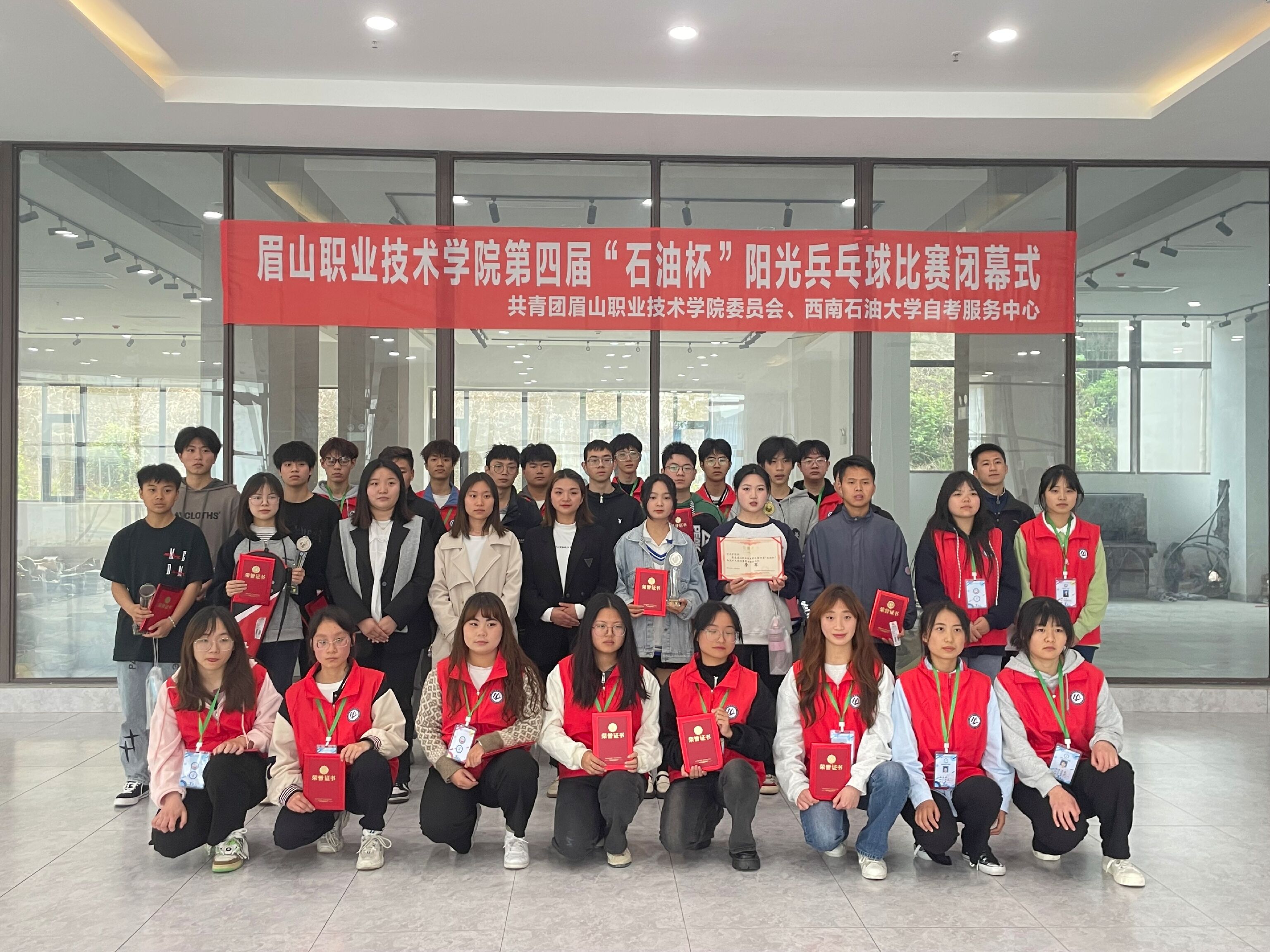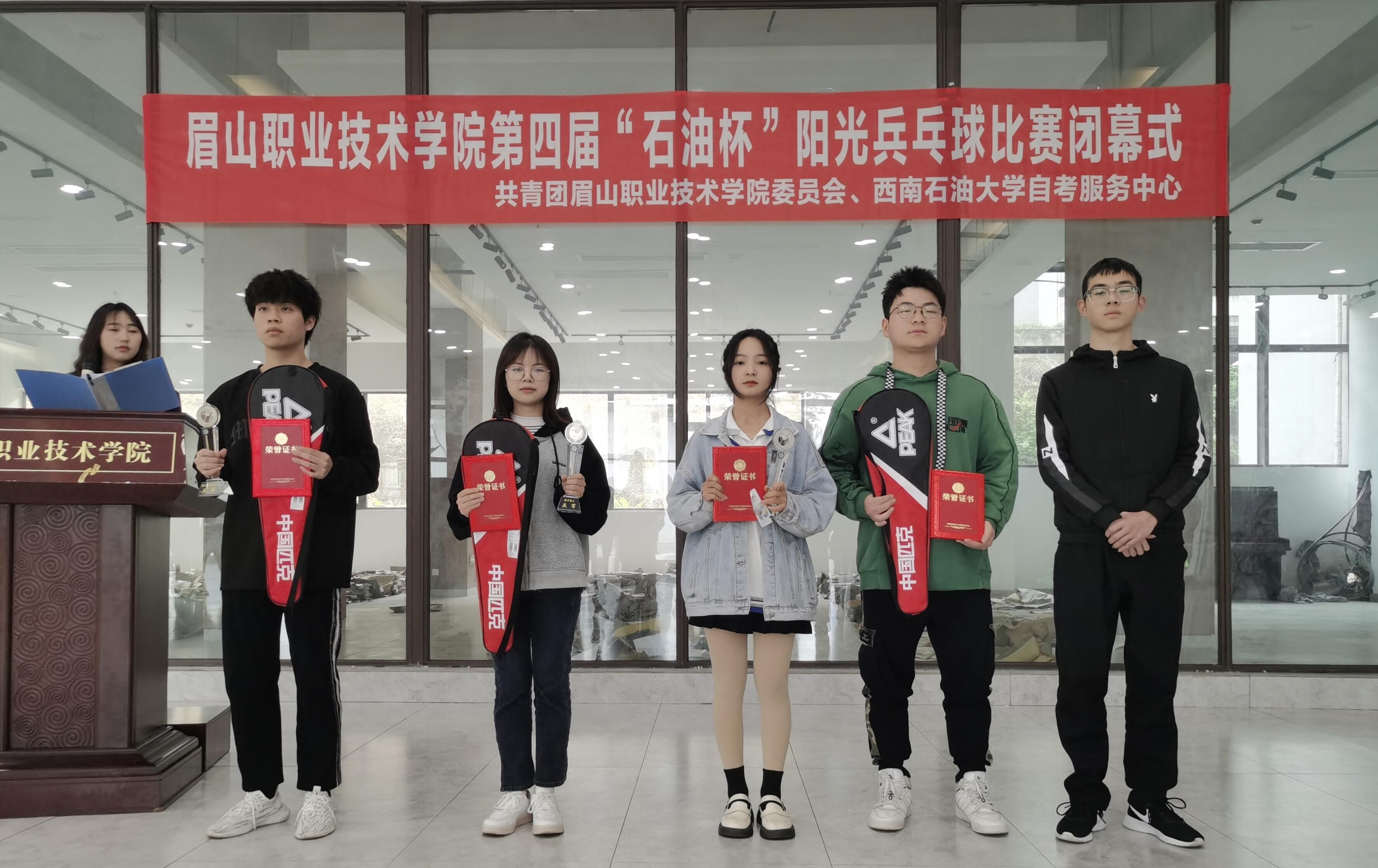 3月31日,团委与西南石油大学自考服务中心联合举办的眉山职业技术学院第四届“石油杯”阳光乒乓球比赛在图书馆负一楼(体育馆旁)顺利闭幕。团委老师黄子钦,西南石油大学自考服务中心老师李兴会、杜琴、吴秋红,参赛人员及工作人员共计50人参加本次闭幕。