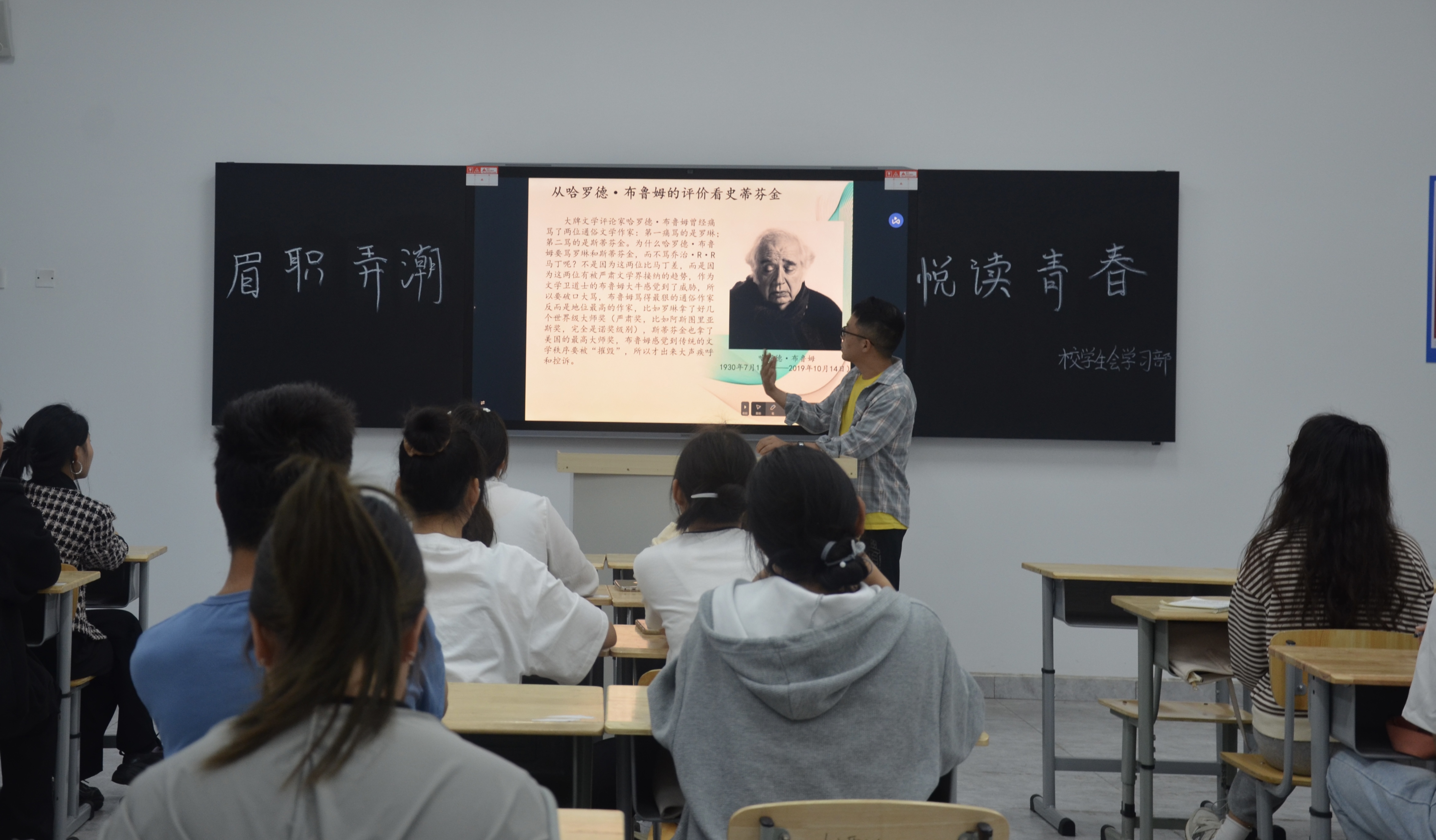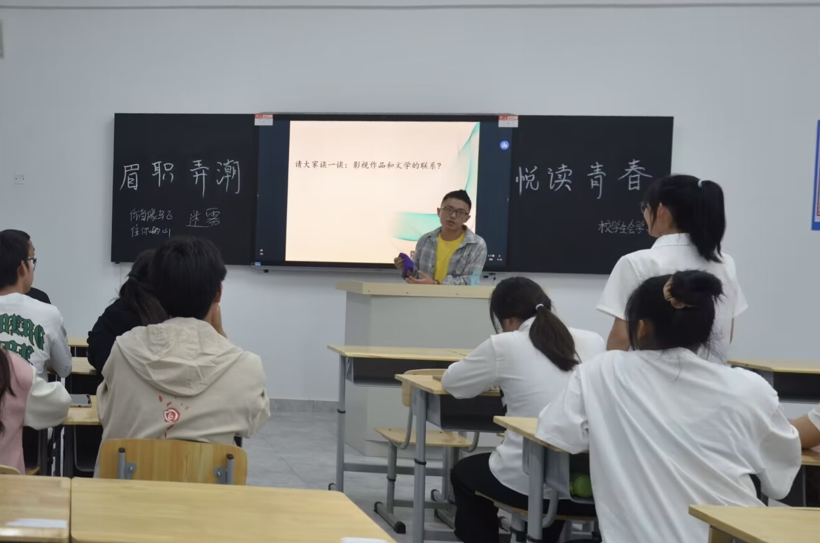 4月13日,团委举办的“眉职弄潮·悦读青春”读书沙龙第四期在6105教室开展,社团指导老师姜阳指导本次课堂,共计45名同学参加。