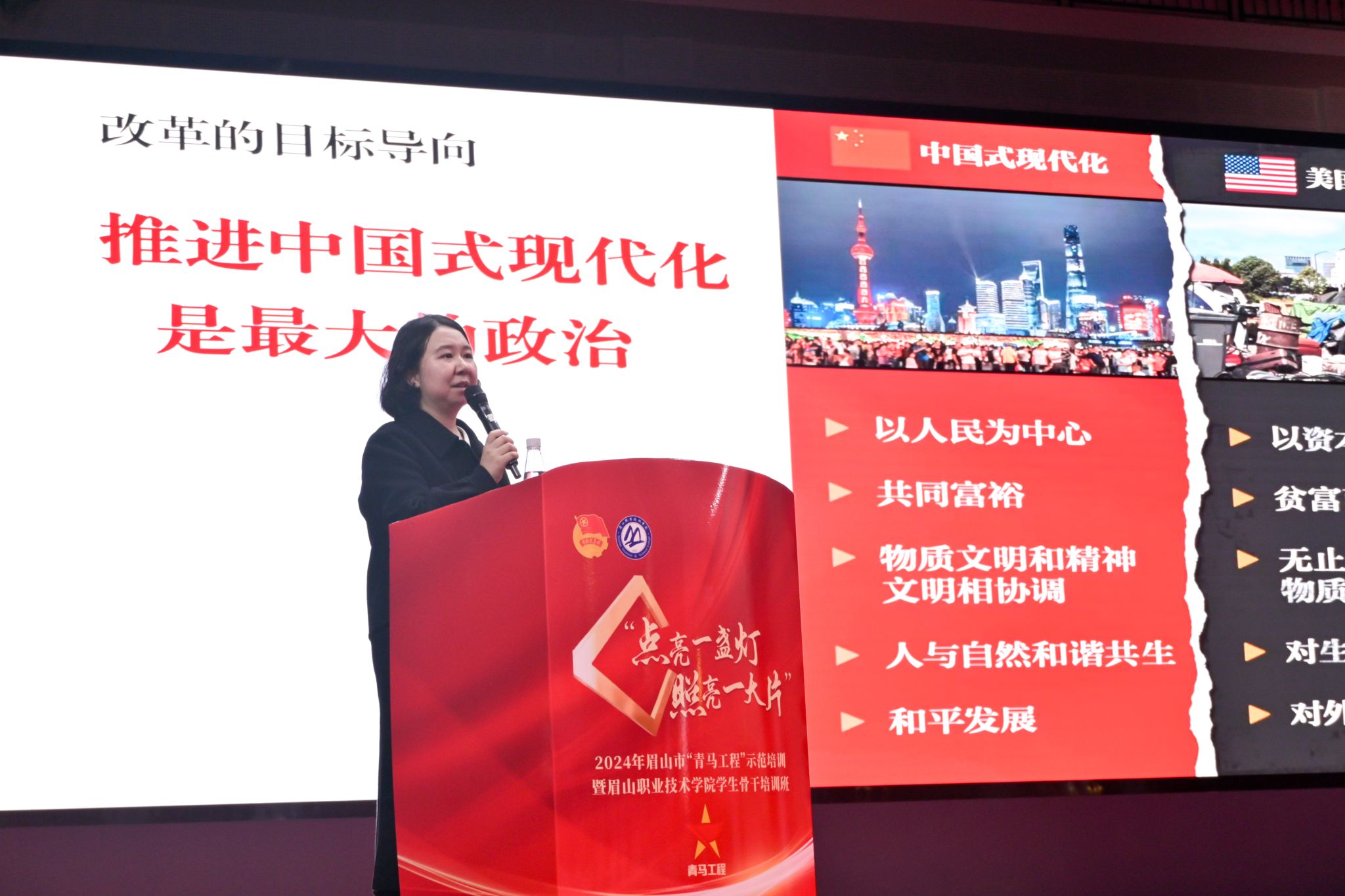 11月14日,2024年眉山市“青马工程”示范培训暨眉山职业技术学院学生骨干培训班第四讲在学校艺术中心成功举办。本次课程邀请市委党校讲师罗曼主讲,聚焦党的二十届三中全会精神及习近平总书记关于青年工作的重要论述。