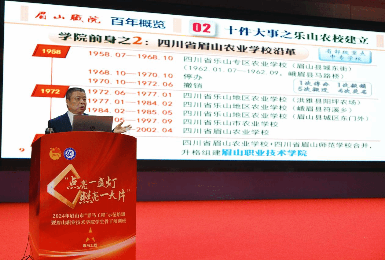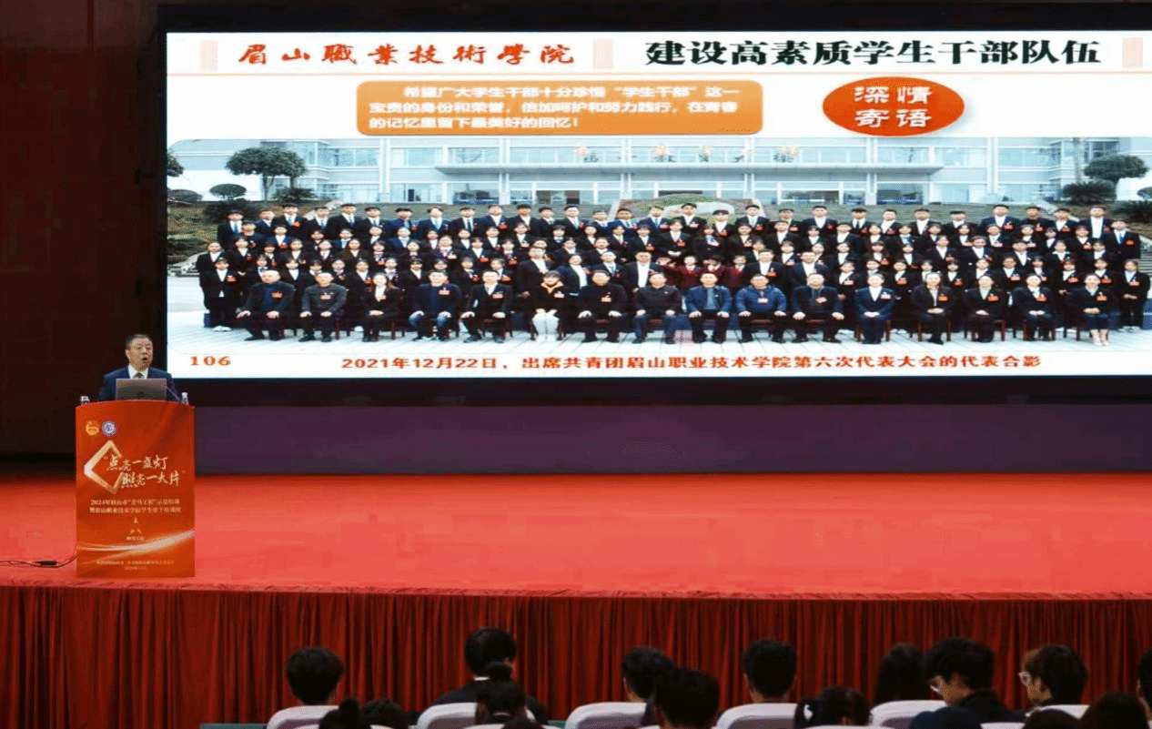 11月14日,2024年眉山市“青马工程”示范培训暨眉山职业技术学院学生骨干培训班第五讲在学校艺术中心举行。邀请我校退休干部、副教授、四川省关工委特聘宣讲员、眉山市关工委宣讲员张献华为青马学员授课。