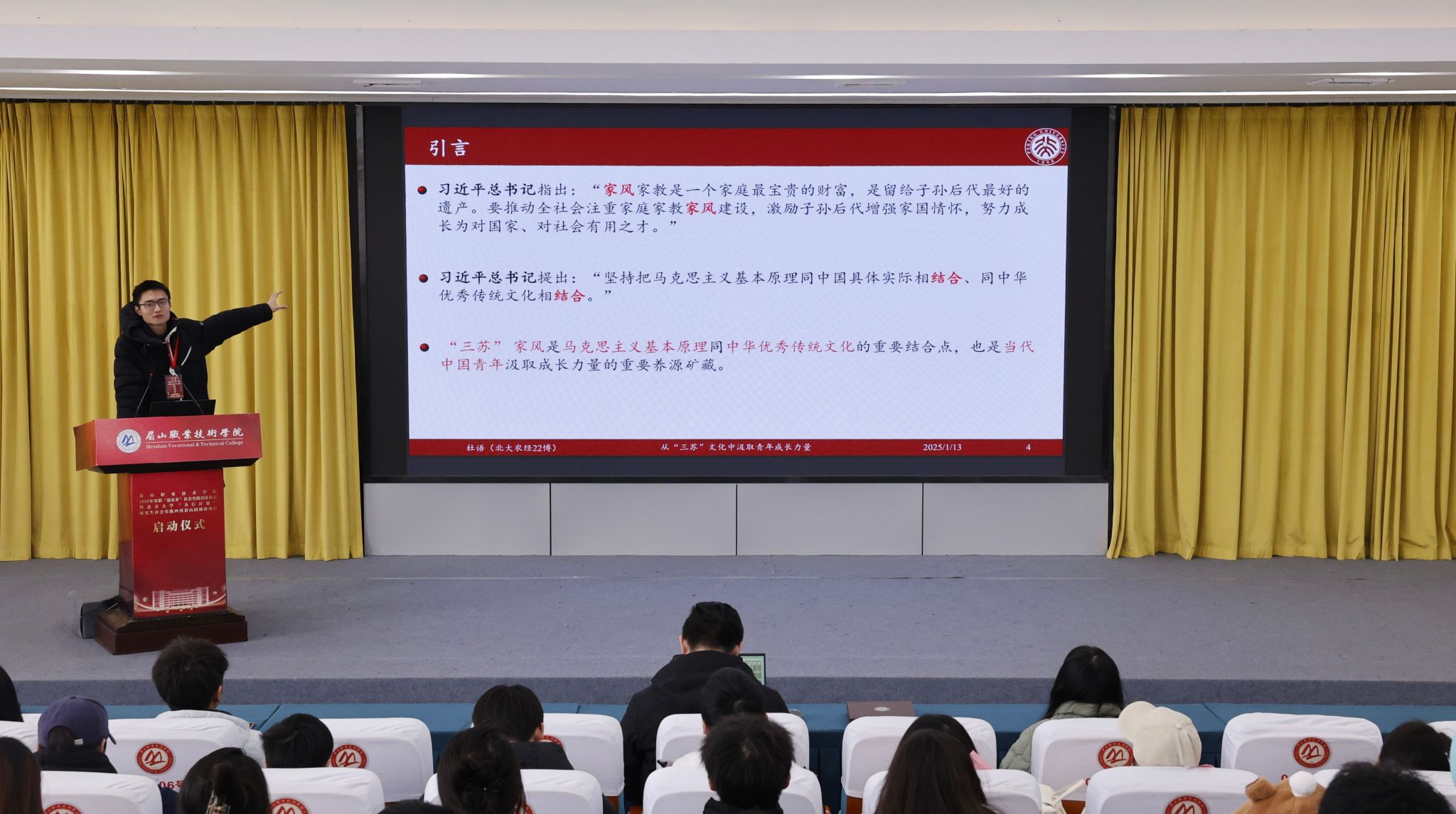 杜语博士则围绕“从‘三苏’文化中汲取青年成长力量——学习把握习近平文化思想的丰富内涵”这一主题展开宣讲。他从“三苏”的家风内涵出发,深入浅出地阐述了读书正业、孝慈仁爱、非义不取、为政清廉等家风精髓。他还结合当下社会背景,剖析了这些家风对当代中国青年的启示与影响,鼓励在场青年学子从传统文化中汲取智慧与力量。